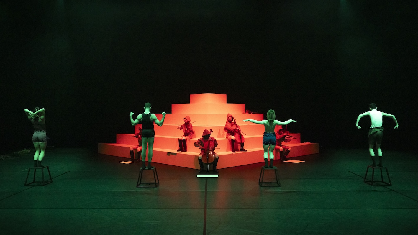 Hunde bellen auch hier und da in „Tournament“, einem Abend des Choreografen Adam Linder, der bereits zum vierten Mal beim Festival dabei ist und sich dieses Mal im Radialsystem mit dem Komponisten Ethan Braun zusammengetan hat. Ana Filipović hat dafür eine weiße, sechsstufige Pyramide auf die Bühne gestellt, die vor allem dem fünfköpfigen Streicherensemble Kaleidoskop in grauen Kapuzenpullis als Spielfläche dient. Braun setzt primär auf die Streicher, für die er das Stück komponiert, lässt aber aus dem Off immer auch zusätzliche Sounds und Musiken einspielen.