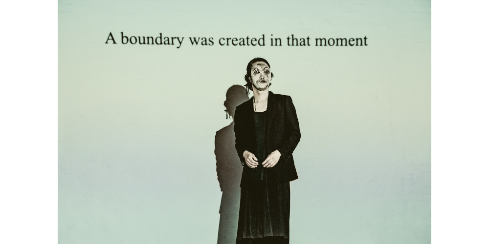 After the chaos of overlapping projections and the Buddhist concept of shura (conflict, suffering, ceaseless agitation), the stage empties. Kawamura stands still, removes his mask and starts to speak. He describes losing someone important. In a poetic voice, the dead become stars that are luminous, distant and visible.