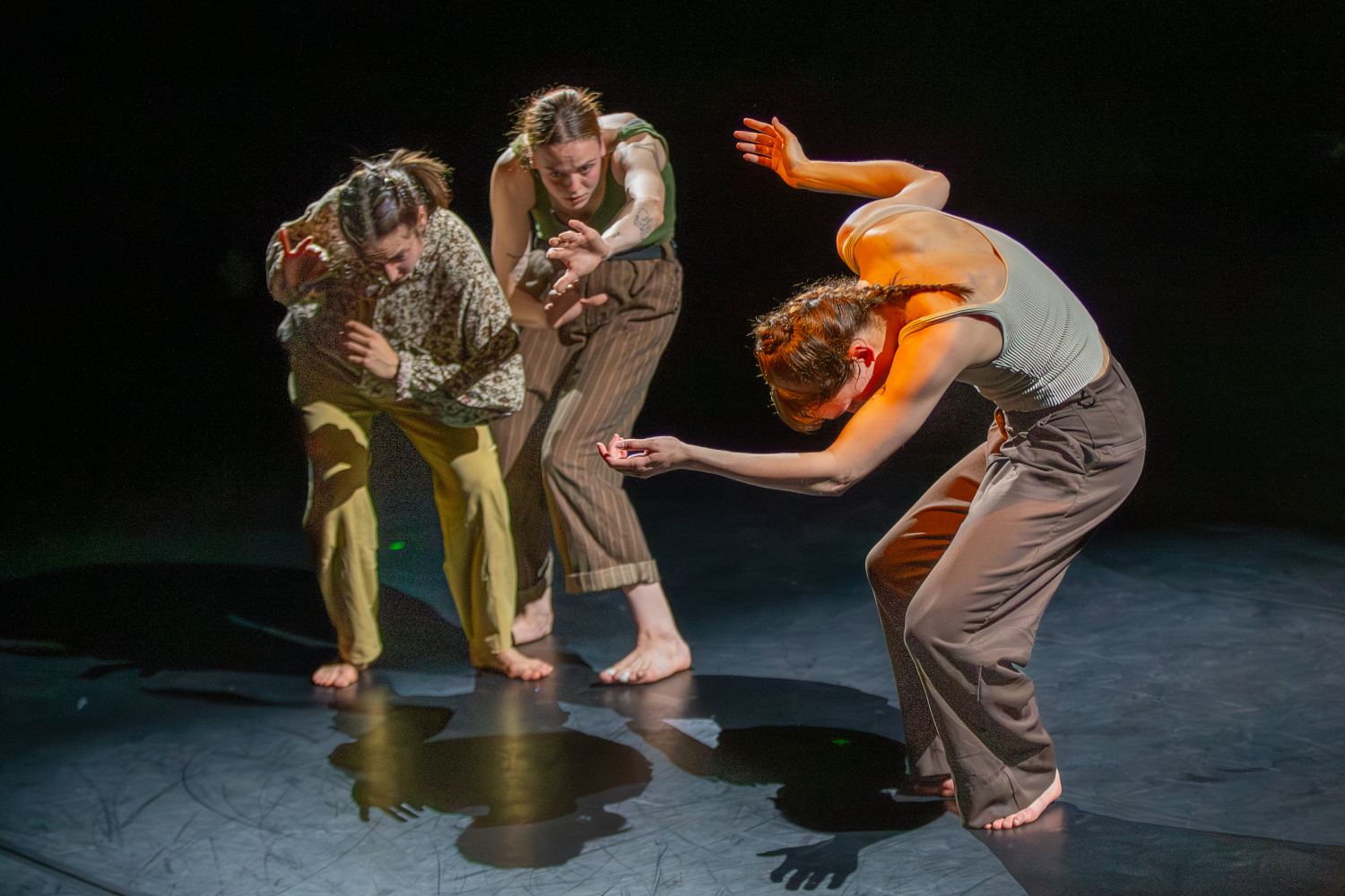 Alle übrigen Mitwirkenden stürmen herein. Man fällt, kauert am Boden, ruckelt sich in die Senkrechte, vibriert ganzkörperlich am Platz – eine Hand an der Brust, die andere etwas tiefer. In schummriger Umgebung konsolidiert sich die Gruppe immer wieder durch synchron ausgeführte Bewegungen. Ganz anders sieht das aus, wenn plötzlich jeder von einem separaten Scheinwerfer erfasst wird. Plötzlich verharren alle wie festgefroren in einer Pose, von denen keine der anderen gleicht.
