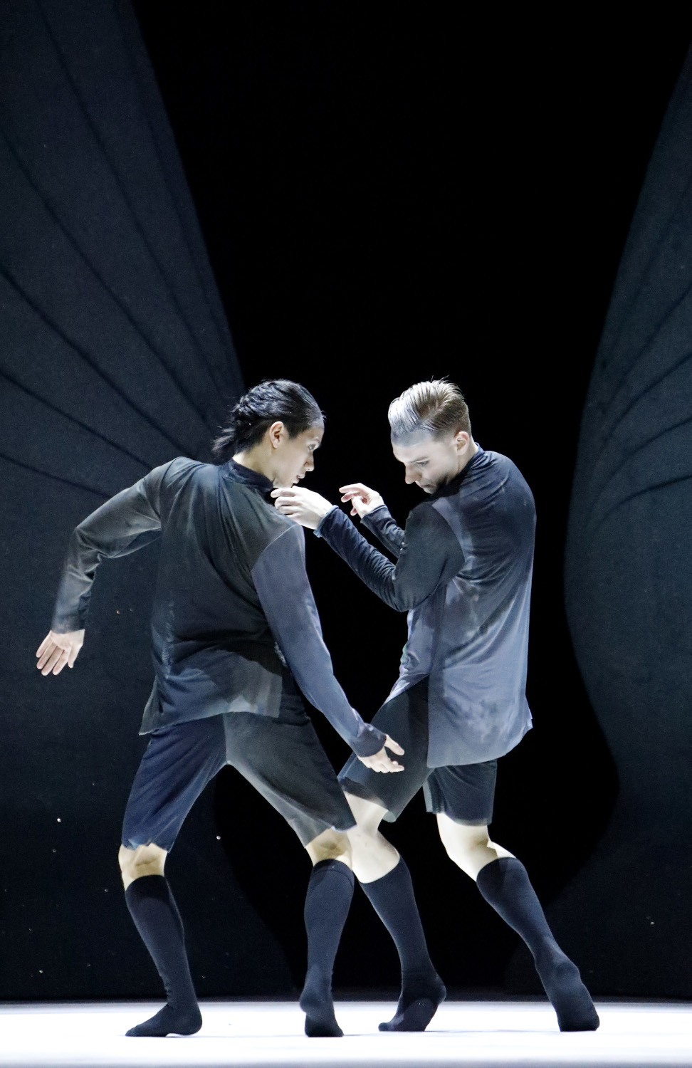 Zum Steinerweichen schön öffnet sich ein überlebensgroßer Monolith, aus dessen Innenleben sich zwei Tänzerinnen schälen. Verstärkt wird deren Suchbewegung durch Gruppenaktionen in gegenläufigen Reihen, mäandernden Schlangen, Schutz suchenden Ballungen. Das Dunkel – ein verführerischer Sehnsuchtsort. Bis auf den weißen Bühnenboden lebt die Schwarz-in-Schwarz-Optik vom Glitzereffekt feiner Grafitsplitter und Lichtstimmungen, die farblich manchmal etwas zu plakativ geraten.