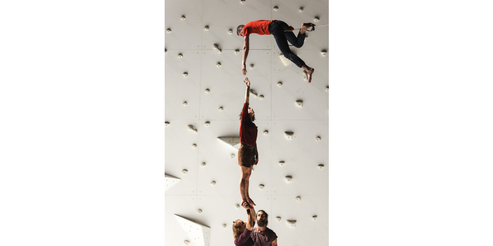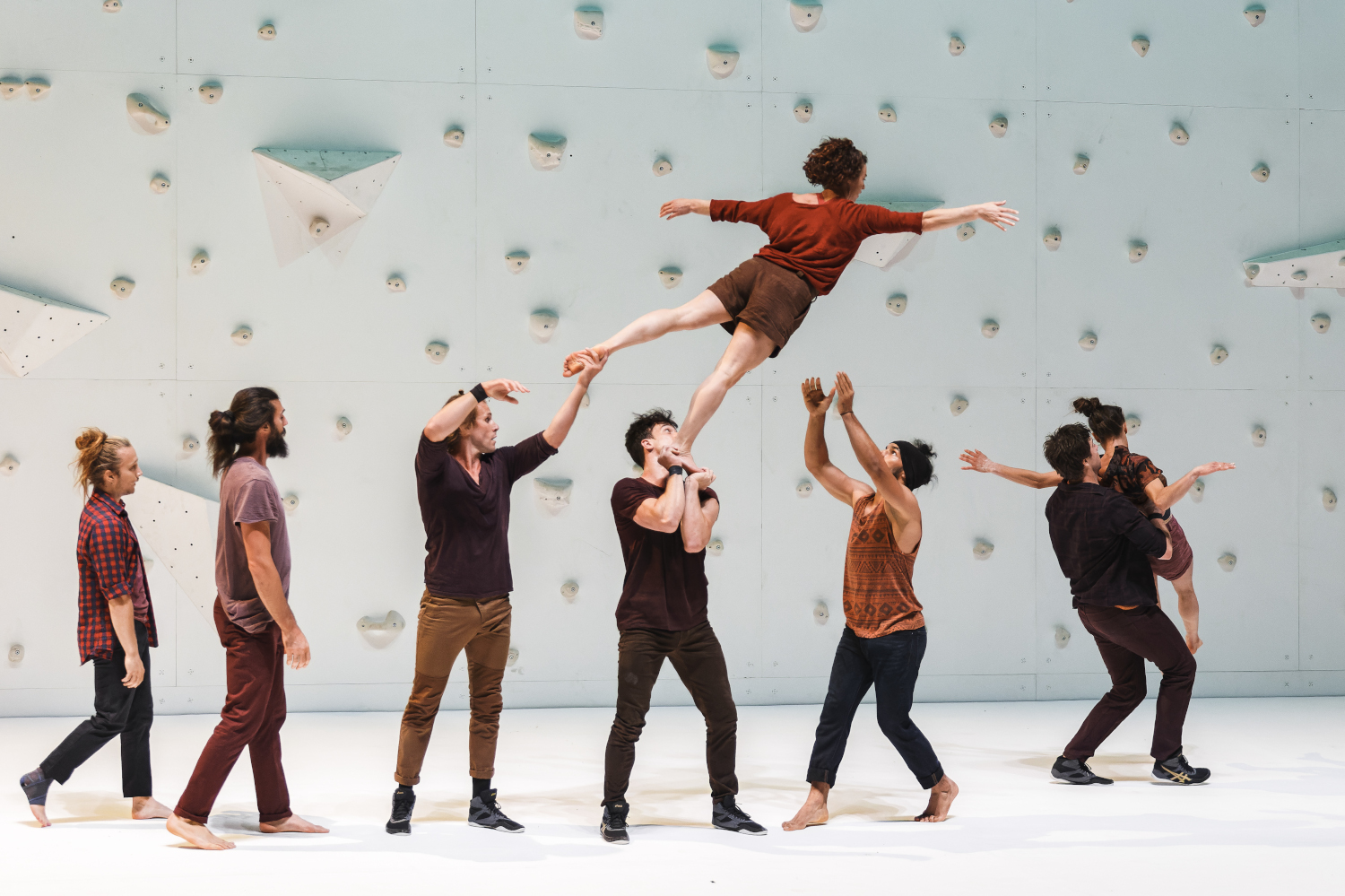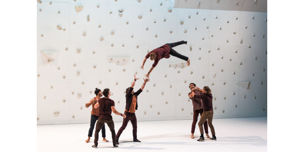 Die neun Tänzer*innen tauchen nach dem Film über und mit Nathan Paulin ganz plötzlich aus dem Nichts auf, schlagartig stehen sie oben auf der Kletterwand. Und jetzt beginnt ein Dialog zwischen Himmel und Erde, zwischen dem Hochseil-Künstler und den Menschen am Boden und in der Wand. Sie laufen die Wand hoch und lassen sich fallen, weich abgefedert von den Händen ihrer Kolleg*innen. Ein wildes Auf und Ab, immer wieder fegen sie mit hohem Tempo über die Bühne, steigen aufeinander, fliegen durch die Luft, schlagen Saltos. Es ist eine atemberaubend rasante Choreografie. Nathan Paulin bestaunt sie manchmal nur still von oben, manchmal mischt er sich aber auch ein. Zu dritt stehen die Tänzer*innen übereinander, fast erreichen die ausgestreckten Hände den auf dem Seil liegenden Paulin, um sie dann doch zu verfehlen.