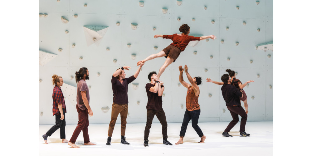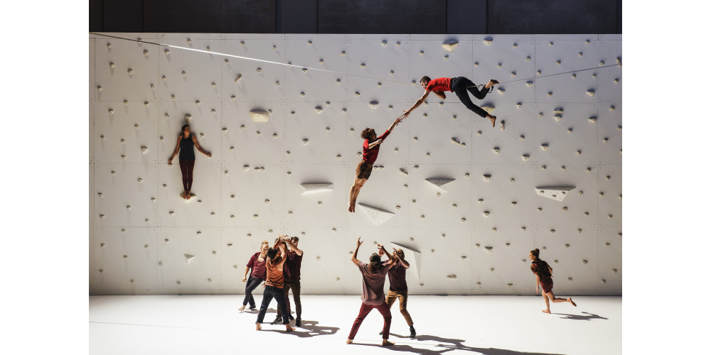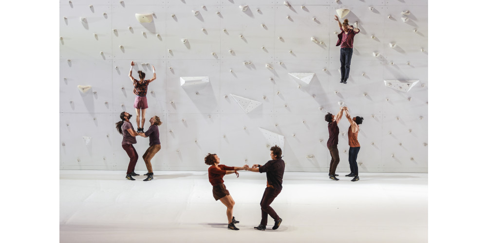 Und wieder kommen die anderen zu Hilfe, wenn sie sich in die Tiefe fallen lässt (in der Videoprojektion fängt sie ihr Sicherungsseil auf, als sie aus Versehen den Halt verliert, bevor sie sich erneut auf den Weg nach oben macht). Wieder erklimmen sie die Wand auf vielfältige Art und Weise. Es ist ein atmendes Auf und Ab der menschlichen Körper, ein Verbinden und Lösen. Bis sich schließlich Nathan Paulin vom Seil ausklinkt und in die Arme der Tanzenden fallen lässt, eins wird mit ihnen und zu einem Teil von ihnen.