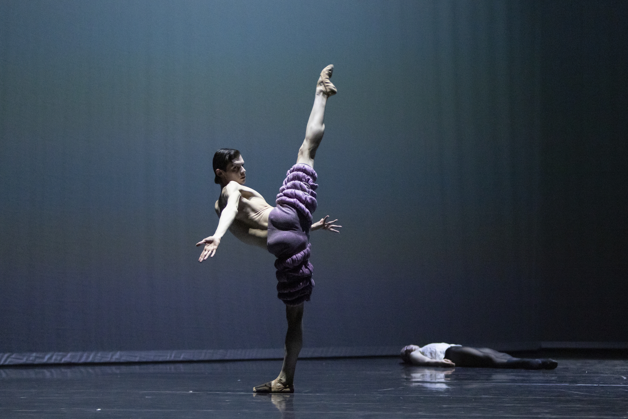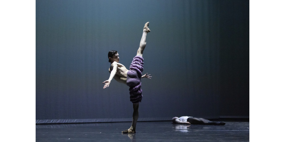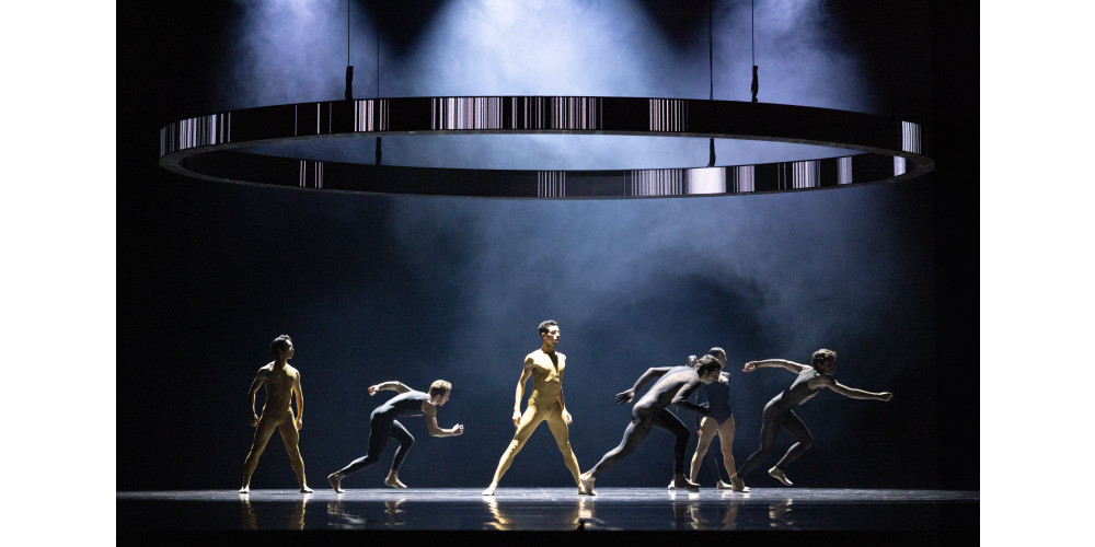 Die beiden Stücke sind auch sonst in vielem gegensätzlich: Während „Lilac“ auf einem fast intim wirkenden Bühnendreieck stattfindet, wird „Oval“ von einem wie ein Raumschiff über der Szene schwebenden Lichtobjekt dominiert (Design: Matthias Singer). Unter dem blinkenden Oval, aber ohne große Beziehung zu ihm, übertragen 12 Tänzerinnen und Tänzer in hautengem Latex Ballettgrundpositionen und Codes in ein tänzerisches Wimmelbild, das nach Zukunft und jenseitigen Welten aussieht, aber nicht nach schönen. So gespreizt, eckig, eiskalt durchexerziert und letztlich auch beliebig ist hier alles. „Lilac“ dagegen hat einen fast elegischen Grundton, der sich nicht nur Lorenzo Bianchi Hoeschs musikalischem Konzept verdankt, das Benjamin Clementines Stimme und Nick Drakes Song „Riverman“ sanft umspielt. Sondern auch den plötzlich weiche Schleifen ziehenden Bewegungen der Tänzer*innen. Während sie die Signature Moves von „Unitxt“ einzuüben scheinen, senkt sich von oben eine Lichtsäule ins Bild, deren Pink an das „Oval“-Objekt erinnert.