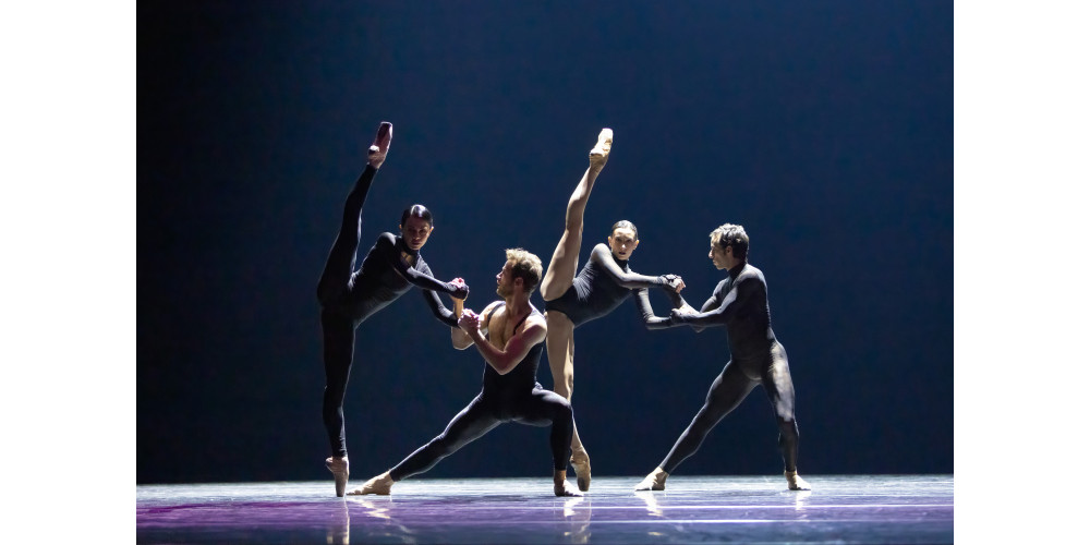 „Noise Signal Silence“ heißt der gesamte Abend. Ein Titel, den Richard Siegal schon verschiedentlich verwendet hat und der mit übergroßen Buchstaben über die Rückwand der nahezu leeren „Unitxt“-Bühne zieht. Hier kann man ihn durchaus programmatisch lesen: „Unitxt“ selbst ist der in jeder Hinsicht elektrisierende Mittelteil des Eröffnungs-Triptychons. Mit der Intro, dem 2019 für das Staatsballett Berlin kreierten „Oval“, fällt Siegal nicht nur akustisch mit der Tür ins Haus, während die Uraufführung „Lilac“ einen überraschend ruhigen Schlusspunkt hinter den Abend setzt.