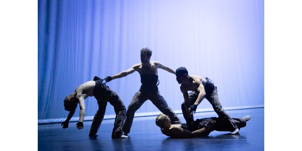 Siegals Neukreation ist selbstreferenziell mit Ansage – und erzählt fast eine kleine Geschichte. Da sind Männer in kurzen Hosen, die Monte Verità-Vibes versprühen, da ist eine martialischere Männer-Gruppe mit ähnlichen Henkeln an den Kostümen, wie die der Industriedesigner Konstantin Grcic für die „weiblichen“ „Unitxt“-Tänzerinnen ersonnen hat: Nutzbar als freiheitsbeschränkende und Sicherheit garantierende Haltegriffe gleichermaßen. Da sind ein paar Frauen dazwischen und ein Spruchband erklärt „we need not destroy the past. It is gone.“, während ein akustisches Gewitter aufzieht.