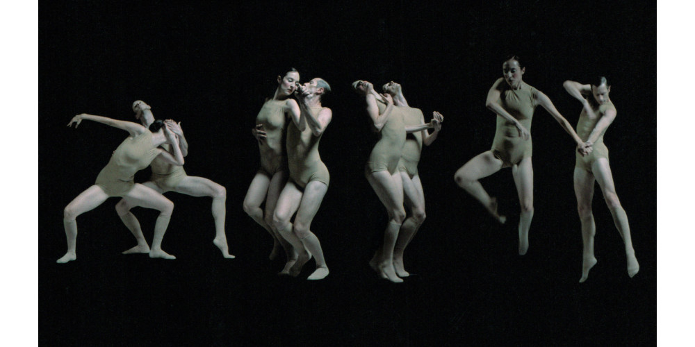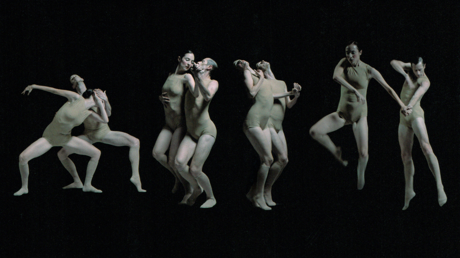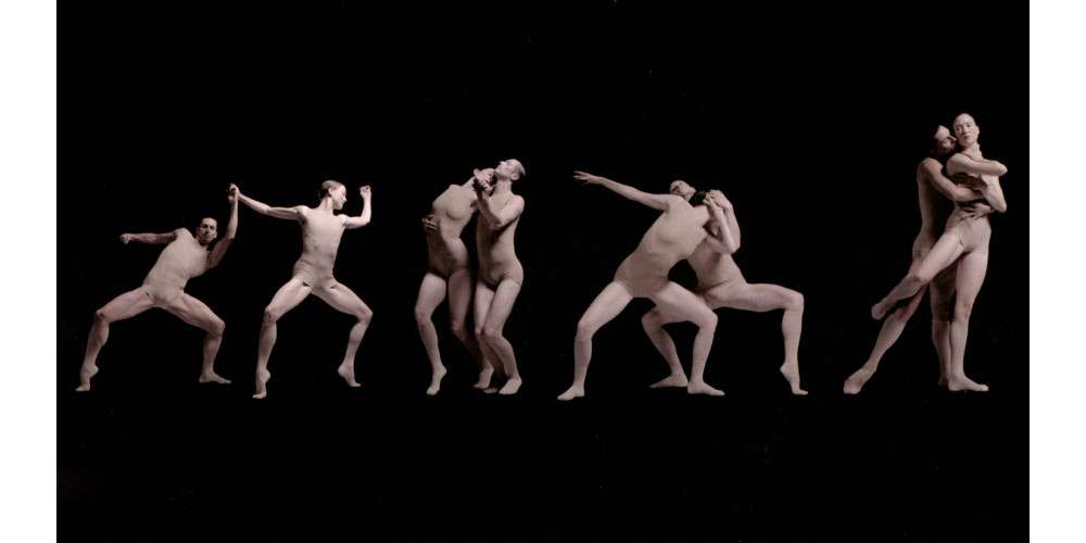 Schon entstehen reliefhafte Tableaus aus menschlichen Kreaturen, die in eckigem Stakkato wie verzerrte Erinnerungen an eine menschliche Vergangenheit wirken. Schon löst die Magierin Eyal ein Damen-Trio, ein Herren-Quartett, ein Solo und immer wieder Duette aus dem Reihen-Motiv. Sie setzt skulpturale Erscheinungen in Gang, die nicht nur ob ihrer Gelenkigkeit und immer wieder weichem Körper-Federn mit ballettartiger Anmutung erstaunen, sondern zunehmend mit maskenhaften, erstarrt wirkenden Emotionen freigelegt werden. Als würde die Bildhauerinnen-Arbeit einer wie besessen Tätigen immer weiter fortschreiten und Gesichter und Körper einschreiben mit einer tiefen Liebe und nach und nach mit den offenen Wunden großen Schmerzes. Akustisch eingearbeitet in die Skulpturengalerie findet sich John Taveners „Funeral Canticle“, gesungen vom Chor der Academy of Ancient Music.