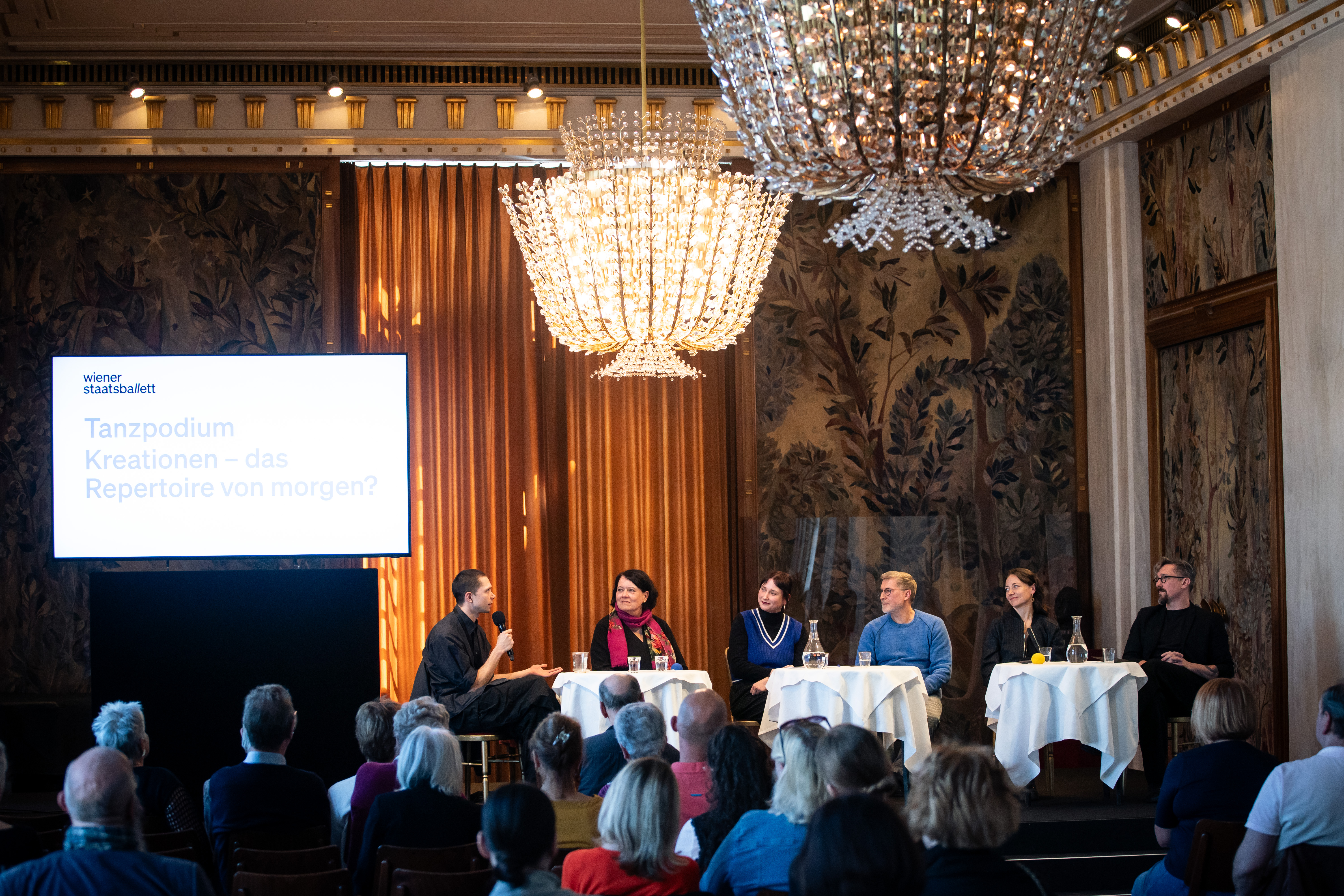 Was lösen Anfragen des Staatsballetts und des Festivals „Johann Strauss 2025 Wien“ bei Choreograf*innen aus? Antworten auf diese heikle Frage, wenn man blauäugig davon ausgeht, dass zunächst einmal so etwas wie Erwartung entsteht, sind vielfältig. Am samstäglichen Nachmittag antworteten die drei eingeladenen Choreograf*innen Alessandra Corti, Louis Stiens und Martin Chaix im letzten „Tanzpodium“-Gespräch mit Martin Schläpfer in der Staatsoper äußerst differenziert auf ihre Einstellung zu freiem Arbeiten und dem Reagieren auf Anfragen innerhalb limitierter Möglichkeiten an Häusern. Sie teilen den letzten Premieren-Abend der Ära Schläpfer im Juni in der Volksoper und beschrieben wortreich und in großer Offenheit ihre Herangehensweisen.