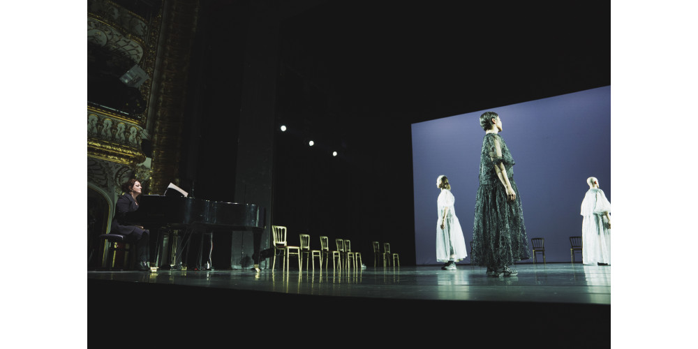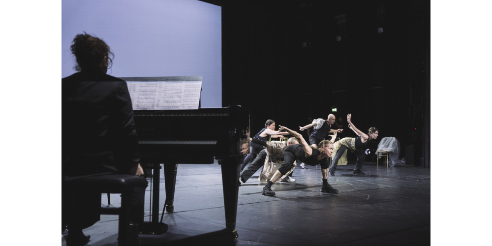 Die Abschnitte wirken wie aus großer Distanz konstruiert, möglicherweise auch mit der strikten Absicht, keinesfalls in Walzer-Kitsch zu verfallen. Der typische Walzerschritt im Rund wird ausgespart, ein Drehmoment erst in der Schluss-Sequenz angedeutet und eine Paar-Haltung am Boden liegend eingenommen. Für die Leichtigkeit dieser Stunde, die sich szenisch als Verweigerung lesen lässt, sorgt Judit Varga am Klavier. Sie setzt leichtfingrig und lyrisch aufgedehnte Strauss-Akzente und schreibt manche Perle fort, während das von ihr programmierte Disklavier den Strauss-Kosmos wie ein übervolles Gehirn ausspuckt.