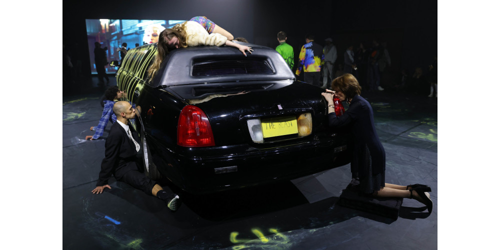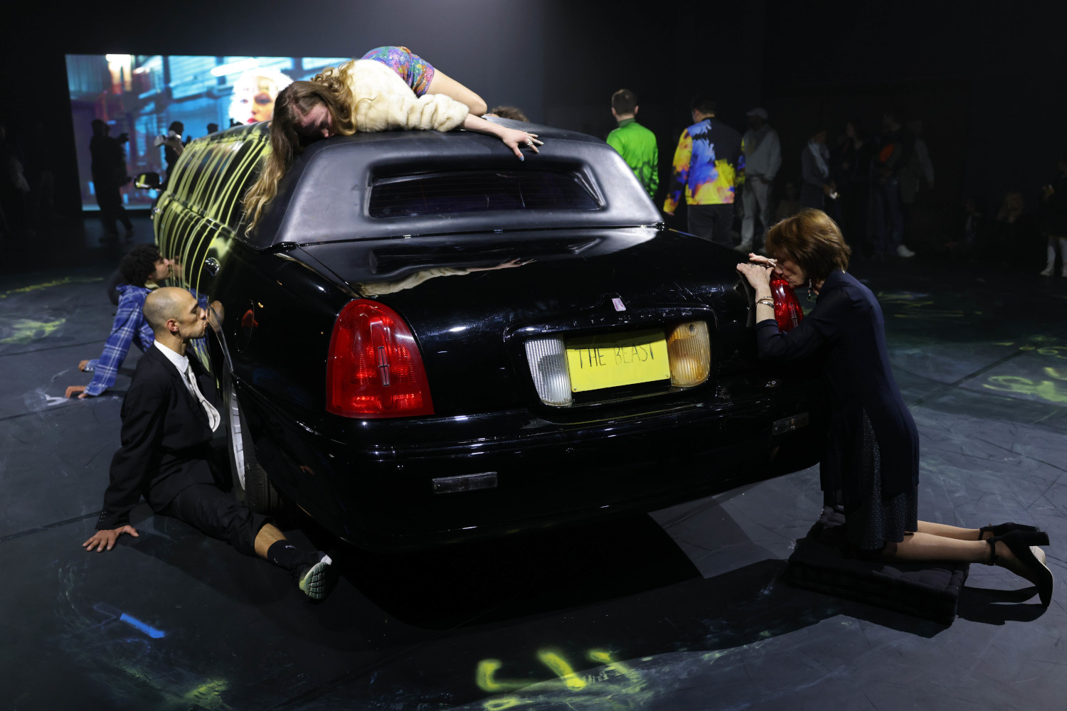 Mit diesen Hintergedanken im Kopf liess sich die anschließende Performance von Ballet National de Marseille und (La)Horde im Muffatwerk verstehen. Wobei hier, sogar offiziell, die Rede von einer performativen Ausstellung ist. Der allseits bekannte Jumpstyle von (La)Horde, mit dem sie in dem Stück „To da bone“ das Publikum europaweit zum Zucken gebracht haben, wird hier in einen größeren Kontext gestellt. In einer Mischung aus aggressiver Subkultur, Klassenkampf und Kapitalismuskritik bekommt der eigentlich so beschwingt unschuldig wirkende tänzerische Ansatz eine bedrohlichere Wirkung: Für „The Master’s Tools“ steht inmitten des Saals im Muffatwerk eine schwarze Stretchlimousine als unmissverständliche Metapher für den Kapitalismus. Um Missverständnissen ganz sicher vorzubeugen, prangt auf dem Nummernschild der Schriftzug „The Beast“. Obwohl die Frontscheibe gesplittert ist und quer über die Längsseite der Schriftzug „We, the People“ gesprayt wurde (Präambel der US-Verfassung), hat der Koloss offenbar nichts an Attraktivität verloren. Über die gesamte Dauer der Ausstellung hängen, liegen, kleben mehrere Performer*innen an und auf der Karre als handelte es sich um einen heilsbringenden Fetisch. Eine erobernde Inbesitznahme zumindest sieht anders aus. Blickt man auf den Titel der Arbeit, lässt sich das lesen als „Man beißt nicht die Hand, die einen füttert.“ Also was? Kritik an der Kapitalismuskritik?