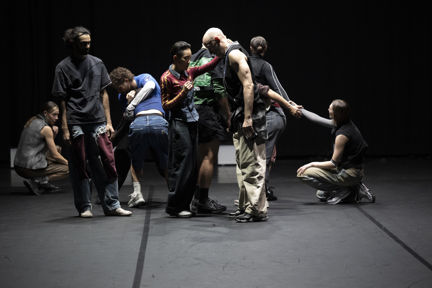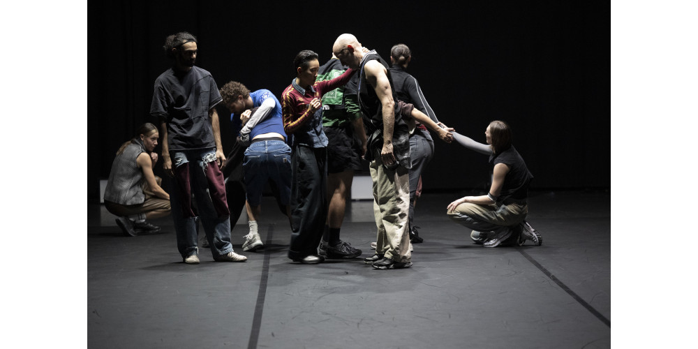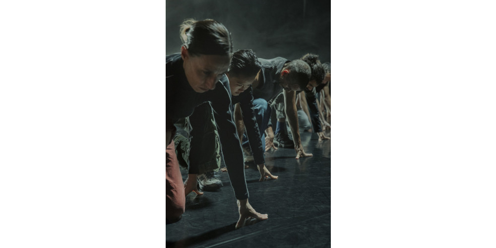 From the second scene onward, individual movements shift toward relationships. One issues signals and commands, others raise hands to pause. Flow, confrontation, cooperation, these elements of the arena are recreated here, but stripped of the purpose of winning or losing. It then followed by a sequence of duets. Starting with the first pair, the ten dancers form five duos, successively entering a resistance of opposite forces. Movements reveal the extremes of the body under gravity, one person supporting another's weight, or parallel performances of identical movements. Each dancer's training background is different, some from technical traditions, others rooted in improvisation. This diversity is precisely the work's strength: it does not pursue uniformity but asks „what is shared by everyone.“