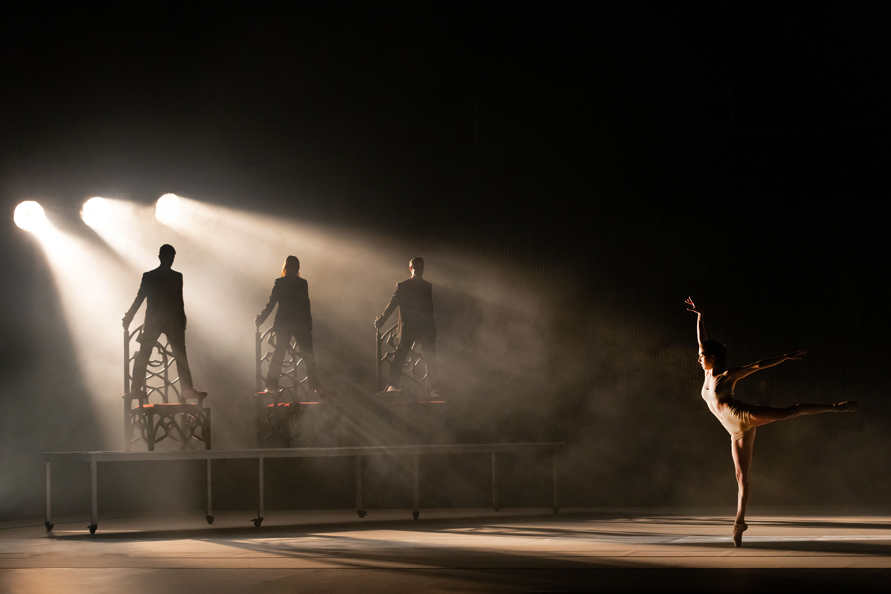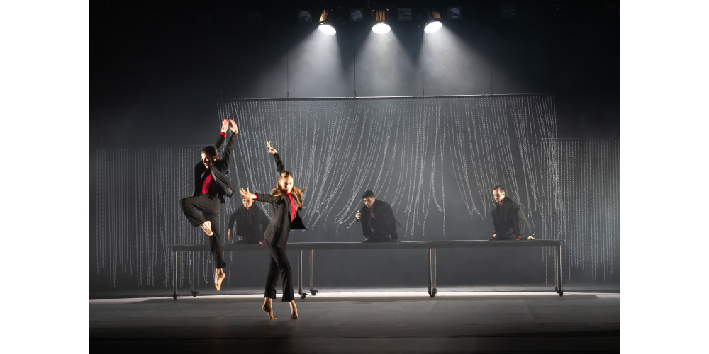 Auf klare Gegensätze im Goth-Style setzt der zweite Teil des Abends. Der israelische Choreograf Yaron Shamir schickt in „Nightingale“ acht Tänzerinnen in einen Zwischenraum zwischen Gefecht und Gericht. Schon in der Anfangsszene thronen drei schwarz-rot gewandete Protagonist*innen wie Hunde an der Kette in starkem Gegenlicht, während vorne eine Ballerina ihre Spitzenpirouetten dreht. Ein Tribunal. Die Bedrohung ist offensichtlich, und natürlich kommt es bald zur Konfrontation, welche die zarte Kunst verschwinden lässt, zugunsten rabiater ausgreifender Choreografie. Das achtköpfige Ensemble stürmt von hinten durch einen Kettenvorhang auf die Bühne. Teuflische Figuren, rasant und voller Energie, mal in großen Gruppen, mal in kleinen Konstellationen. Immer wieder aber tauchen auch die zarten Tanzwesen auf, die sich behaupten müssen gegen diese rot-schwarze mephistophelische Welle, werden davon getragen, umschwärmt und, ja, auch begehrt. Dabei verlieren die kleinen Teufel*innen fast ihre gesamte Kleidung, tanzen nur noch in schwarzen Tops und Shorts gegen Ende. In die Bewegungen mischen sich auch schon mal Hip-Hop-Moves.