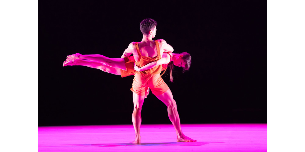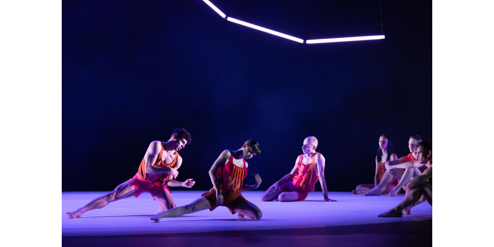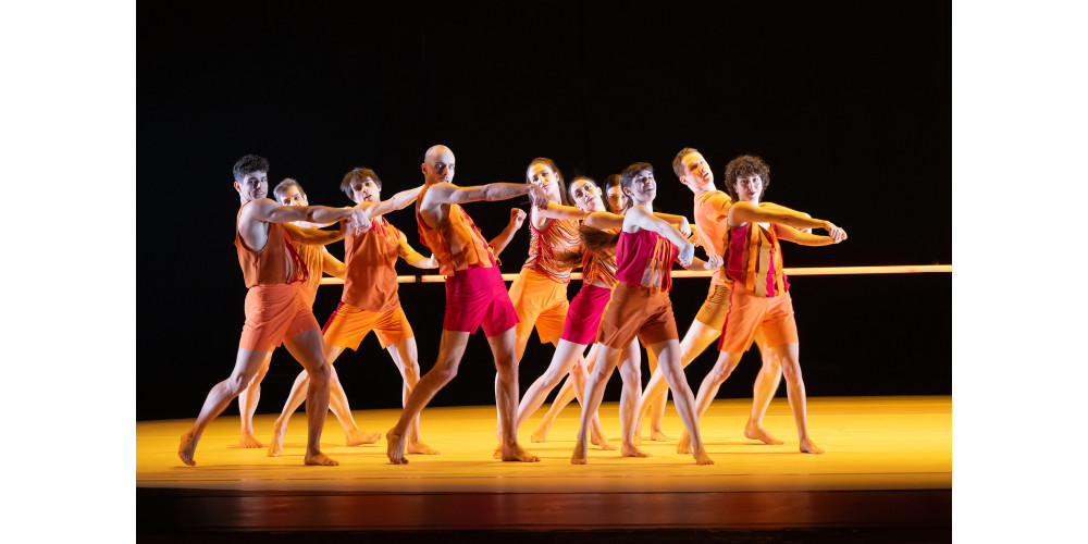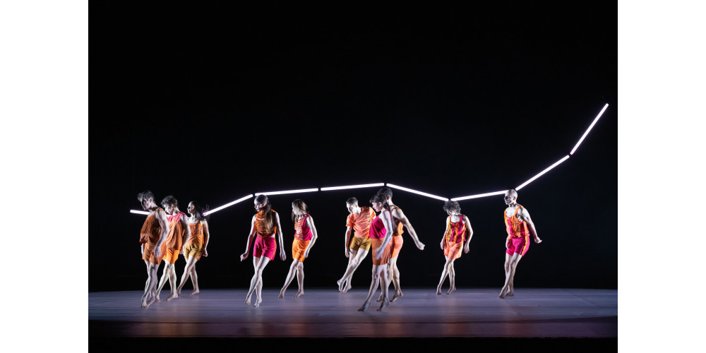 Den Anfang macht der Italiener Nunzio Impellizzeri mit „Flam.Me.Um“. Der Titel verweist zum einen auf den antik-römischen Brautschleier, als auch das Weiße im Inneren einer Orange. Und orange ist zunächst auch die dominierende Farbe der aufgeschlitzten Kostüme, der zehn Tänzer*innen. Zunächst hinter Gaze posieren einige Tänzerinnen, kleiden sich an, um dann um den großen Kreis der Drehbühne eine Art Fest zu feiern. Im Hintergrund fährt derweil eine leuchtende Gelenkskulptur als bewegliche Linie herunter, die sowohl Form als auch Farbe ändern kann. Impellezzeri setzt auf weiche Bewegungen, einen dauernden Flow, fluide und ohne klare Setzungen.