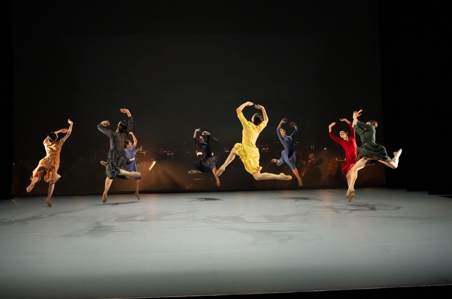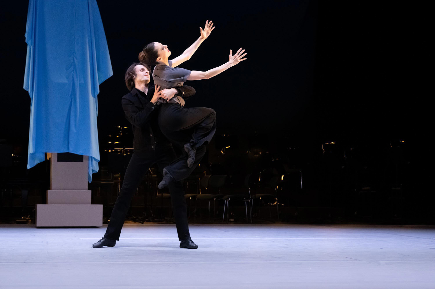 Wenig überraschend endet der Abend daher mit einem Abschied: Nach einer Videosequenz, die Norths und Cooks Arbeitsweg bis in den Probenraum dokumentiert, übernimmt ein Duett auf der Bühne. Das sich einander vertrauensvoll hingebende Miteinander zwischen einem jungen Robert und einer jungen Sheri – so suggerieren es die Frisuren der beiden – wird unterbrochen: Die erst ehrfürchtig schreitenden, dann in Reihe tanzenden Kostüme aus früheren Arbeiten Norths in Gestalt der Tänzer*innen des Ensembles wollen den jungen Robert mit sich nehmen, ihn nicht gehen lassen. Am Ende entschwindet er aber doch mit Sheri ins Off.
