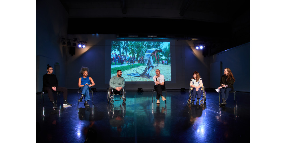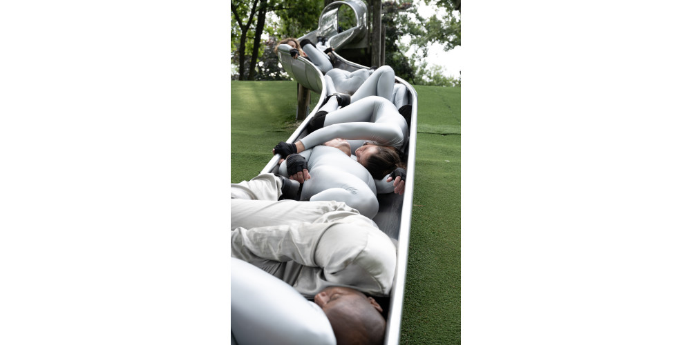 In the video, we see people slowly sliding down a slide, stacking themselves like silver pearls on a string. We see people using their wheelchairs as a playmate to balance equipment. The performers experiment with the playground and its equipment to discover new ways of interacting with them. They reverse functions and create new ones with the existing material. Movements of the equipment are taken over by the performers. The rocking motion of the equipment is, for instance, mirrored by performers to such extremes that they nearly fall over. They work with the distance to the objects and the intensity of the movements.