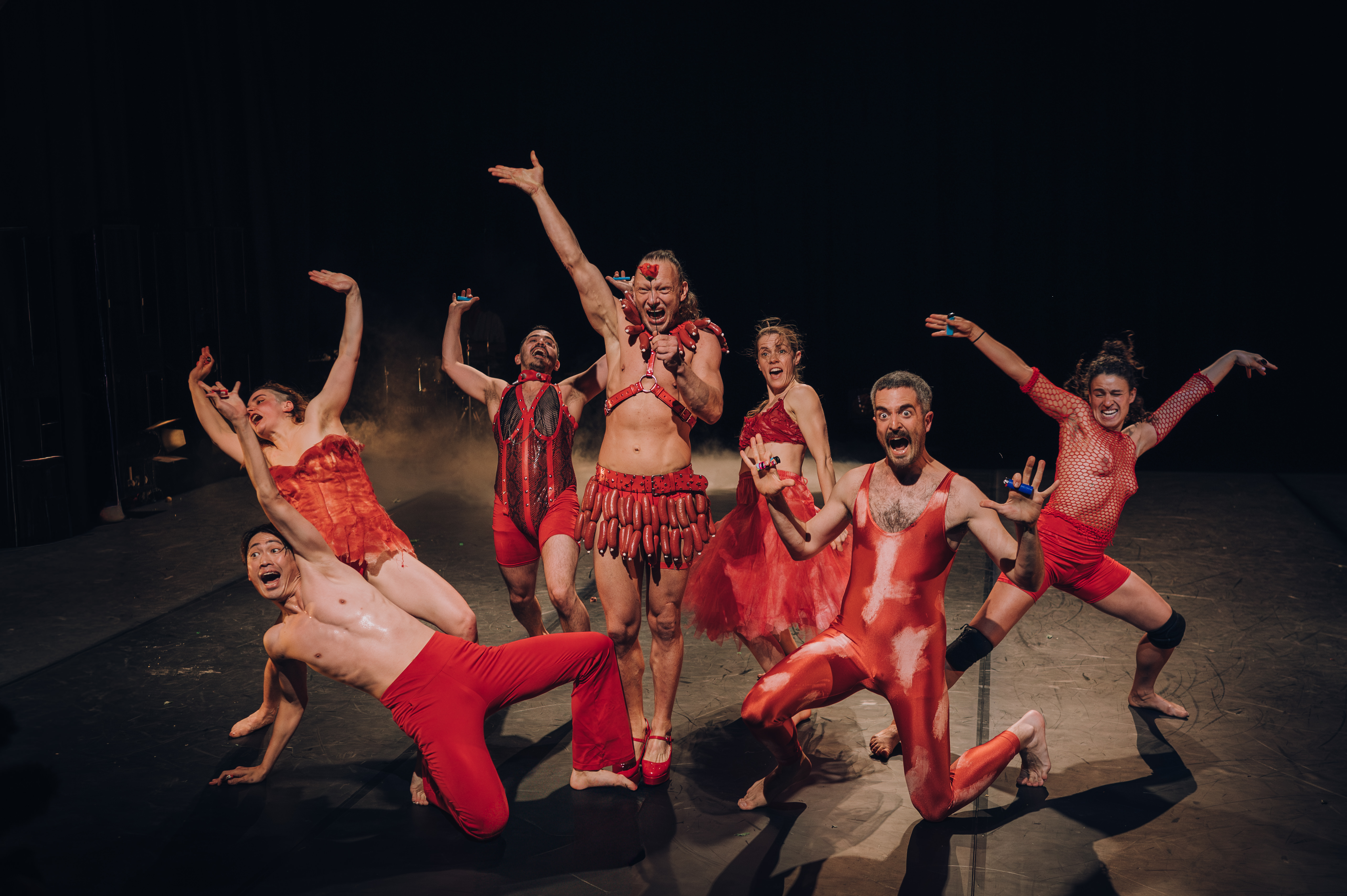 Dabei steht doch eigentlich das Schweine-Wurst-Land im Vordergrund. Etwa in Form der Wurstmaschine, wo das Publikum Zeuge einer Live-Wurstproduktion wird, die einem Performer mit Schweinekopf galgengleich, um den Hals gewickelt wird. Maskenköpfe und Menschenkörper werden mit Schinkenscheiben belebt, ein roter Wurstgott tritt in einer an brasilianischen Karneval erinnernden Beschwörungsnummer auf, die abgeschlossen wird von einem japanischen Reigentanz. Es gibt die angedeutete Ausweidung eines Schweines mit Herz, Darm und Eingeweiden, und unter dem pendelnden Herz taucht schließlich Tirza Ben Zvi ab. Drastisches kombiniert sich mit Lustigem, Visuelles mit Olfaktorischen. Bodytalk ist hier ganz bei sich und lässt Tanzende wie auch das Publikum kaum zu Atem kommen, angesichts der auf alle ballernden Bilder und den daraus folgenden Assoziationstsunamis.