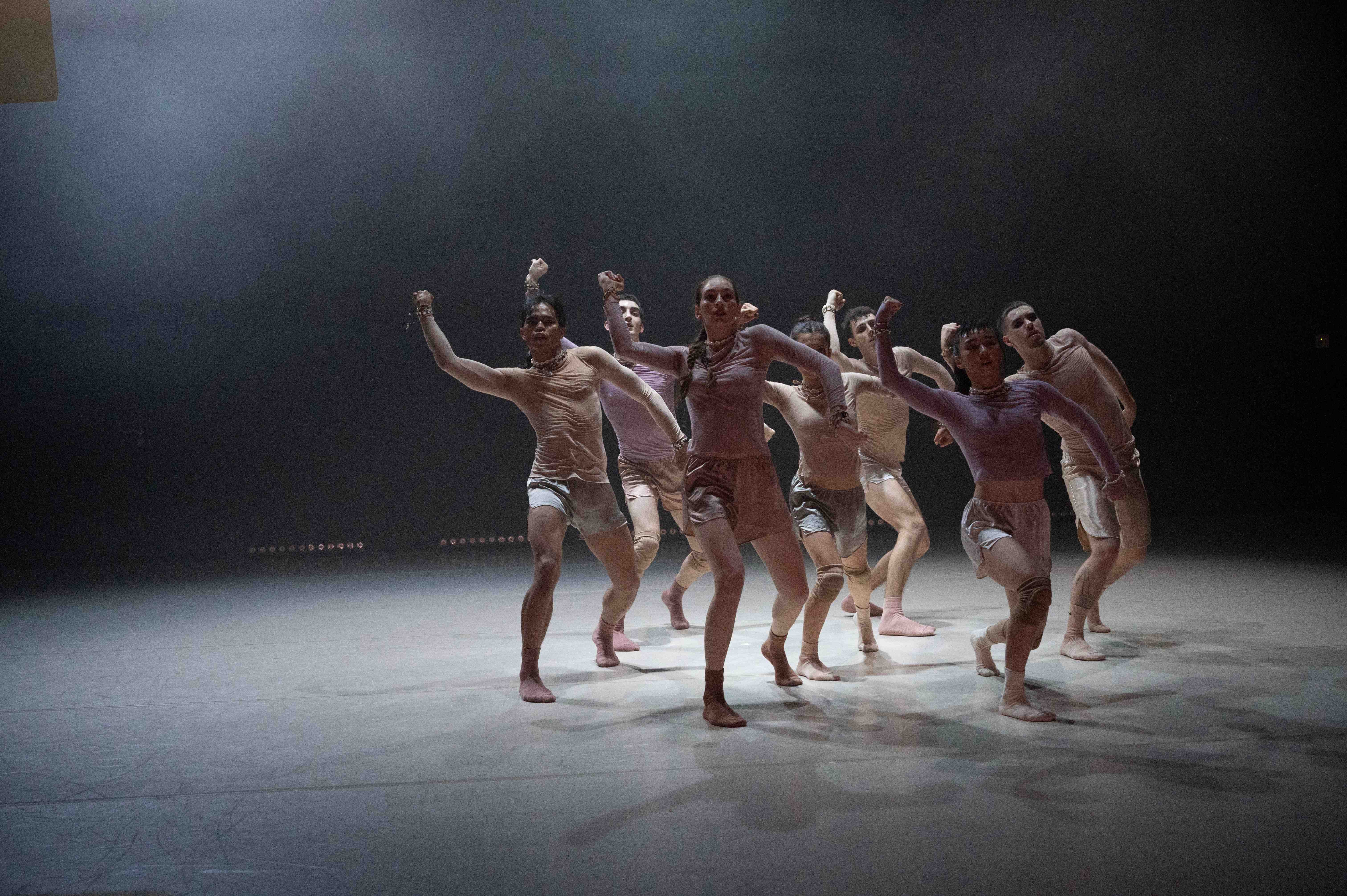 Die Musik (zuerst Hird, dann Lumisokea und schließlich The Knife) ändert sich mit Klängen von Tropfen, Glocken und ein fernes Metallophon. Dazu agiert das mittlerweile vollständige Ensemble, gekleidet in eng anliegenden, schwarzglänzenden Anzügen, mit weit ausholenden, abwehrenden Bewegungen. Immer wieder stehen sie in tiefen Schrittstellungen, wie man es aus dem Kampfsport kennt. Choreograf Samir Calixto arbeitet auf beeindruckende Weise mit dem Raum. Da steht das Ensemble mal im hinteren Bühnenteil in einer Reihe, dann fliegen die Tänzer*innen plötzlich wieder auseinander, um sich in einer Diagonale quer durch den Raum wiederzufinden. Wie sie sich immer wieder neu im raschen Tempo aus großen Gruppenformationen zu kleineren sammeln oder vereinzeln, wirken sie wie Moleküle. Da stoßen sich Atome voneinander ab und finden wieder zueinander - sei es in Linien oder in geometrisch anmutenden Gebilden, die sich wie an einer langen Schnur gezogen, über den Tanzboden bewegen.