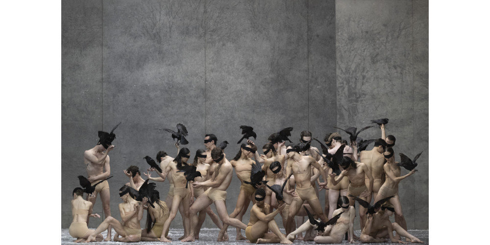 Noch bevor die Musik beginnt, stakst ein Wanderer mit weiten, grotesken Bewegungen über die Bühne. Der zusammengeknäulte Schwarm schwarzer Gestalten erwacht langsam, synchron. Am Rand steht starr eine Frau, die mit verbundenen Augen einen Raben hält. Dann erklingt das bewegende Lied: „Fremd bin ich eingezogen / Fremd zieh‘ ich wieder aus.“