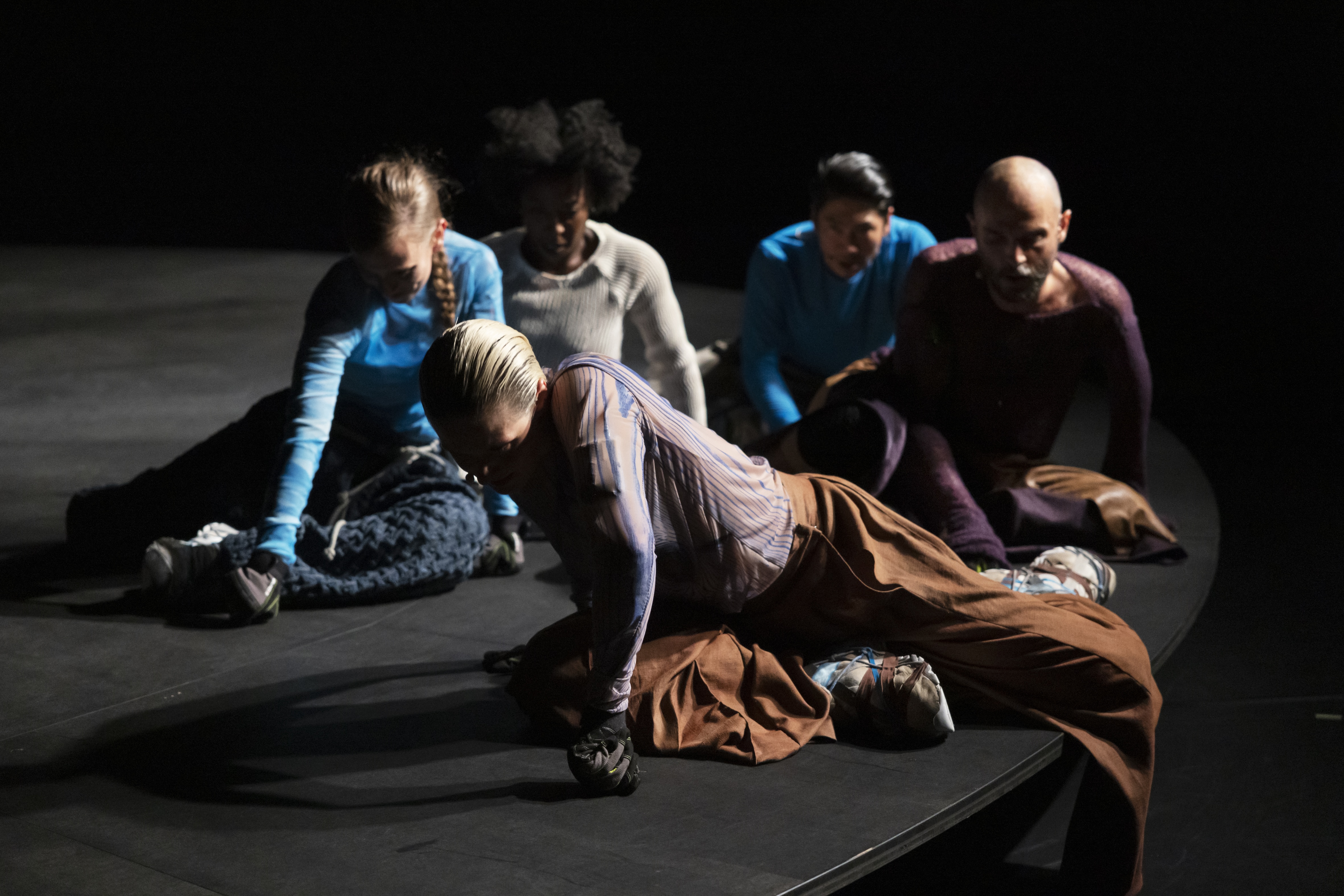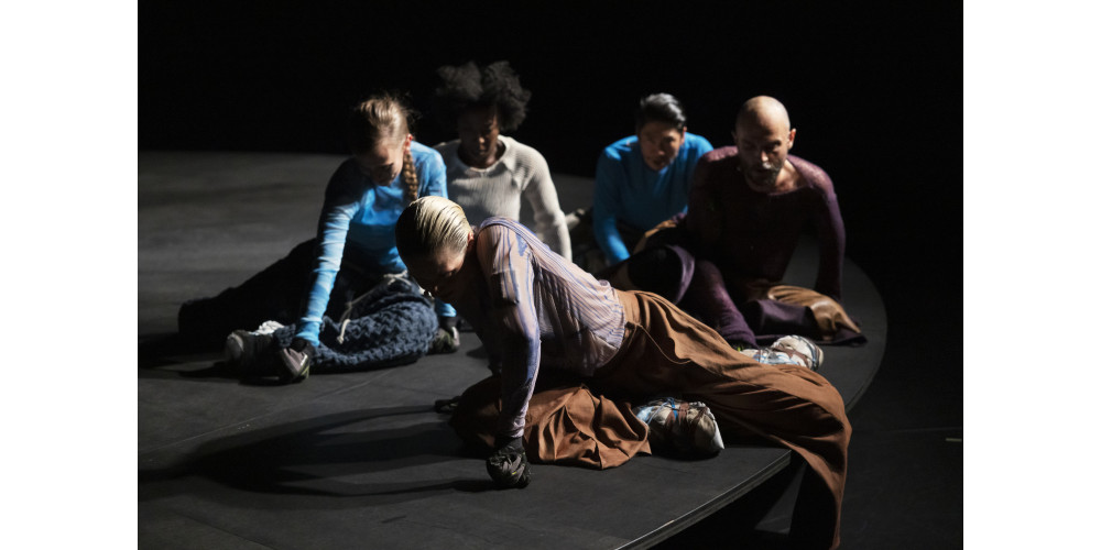 Rastlos ist auch die Drehscheibe, die ab diesem Moment nicht mehr stehenbleibt, sondern sogar beschleunigt – ein unaufhaltsames mechanisches Getriebe aus menschlichen Körpern und Technik, Stimme und Klanglandschaften. Wie mechanisch gesteuerte Löwen schieben sich die Performer*innen auf Fäusten und Knien über die Scheibe, lassen sich als leblose Gestalten an der Scheibe hängend über den Bühnenboden schleifen, um schließlich einer evolutionären Entwicklung folgend ins aufrechte Stehen und Gehen zu kommen.