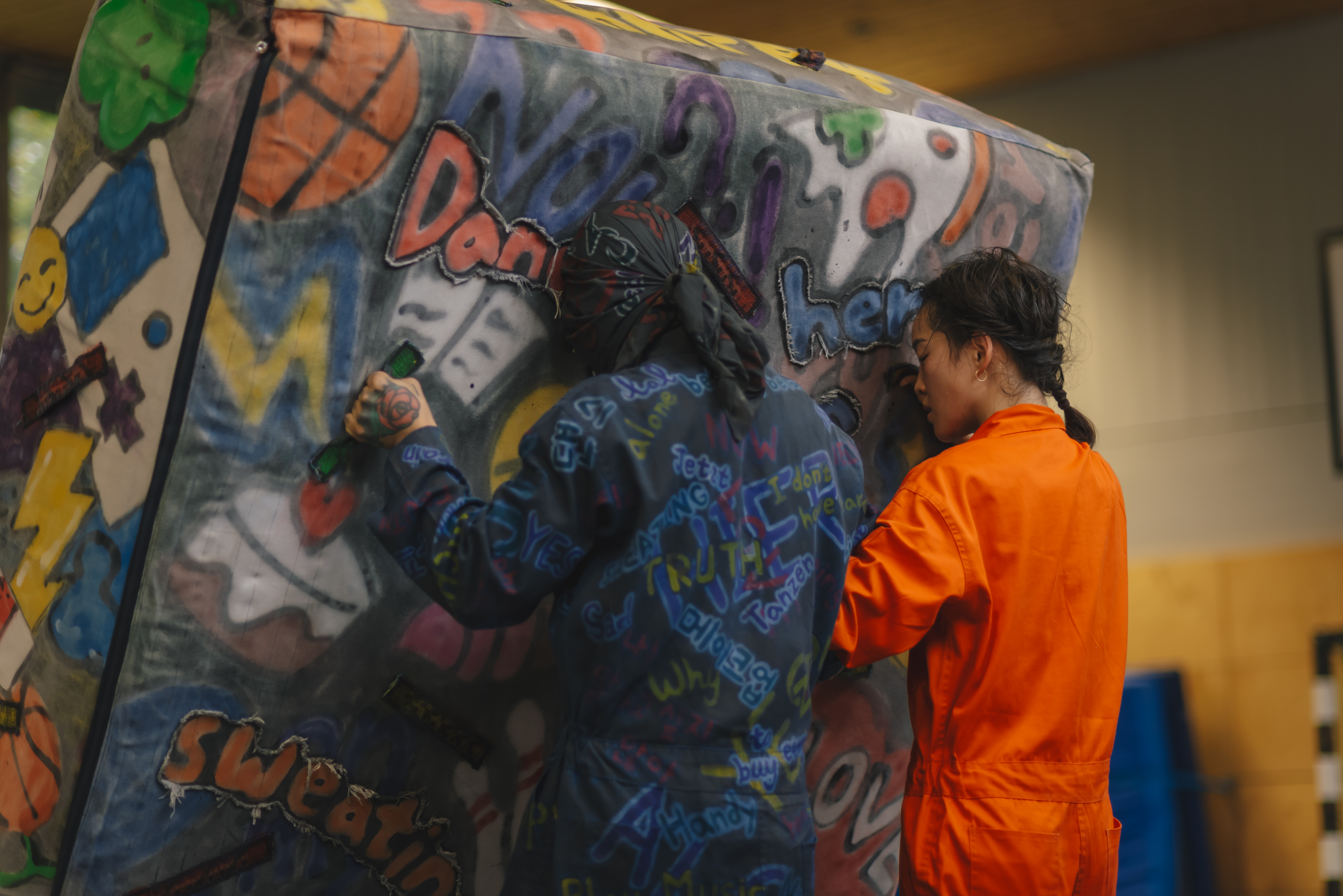 Als später eine weitere Person hinzukommt, deren Gesicht komplett verhüllt bleibt, bindet Lee die unerwartete Begegnung mit ihrem Partner Jihun Choi in eine handlungsfrei abenteuerliche Reise ein. Und die führt in „WUW – Wind und Wand“ quer durch unterschiedlichste Gemütszustände, über imaginäre Abgründe und Wände, die es zu erklimmen gilt. Lee und Choi interagieren dabei immer gewagter und akrobatischer. Denn stellvertretend für Mauern, die im Leben überwunden werden müssen, beginnt sich irgendwann eine comicartig-bunt bezogene große Turnmatte mit ins Bild zu drängen. Das Requisit ist vollgekritzelt mit Sprüchen, einschlägigen Symbolen und freizeittauglichen Objekten. Es verschmilzt mit Choi, der darauf oder dahinter in seinem blau-schwarzen Ganzkörperanzug kaum auffällt. Lange verharrt diese Matte unbeachtet im Hintergrund. Plötzlich stellt sie sich dann – wie von Zauberhand – auf.