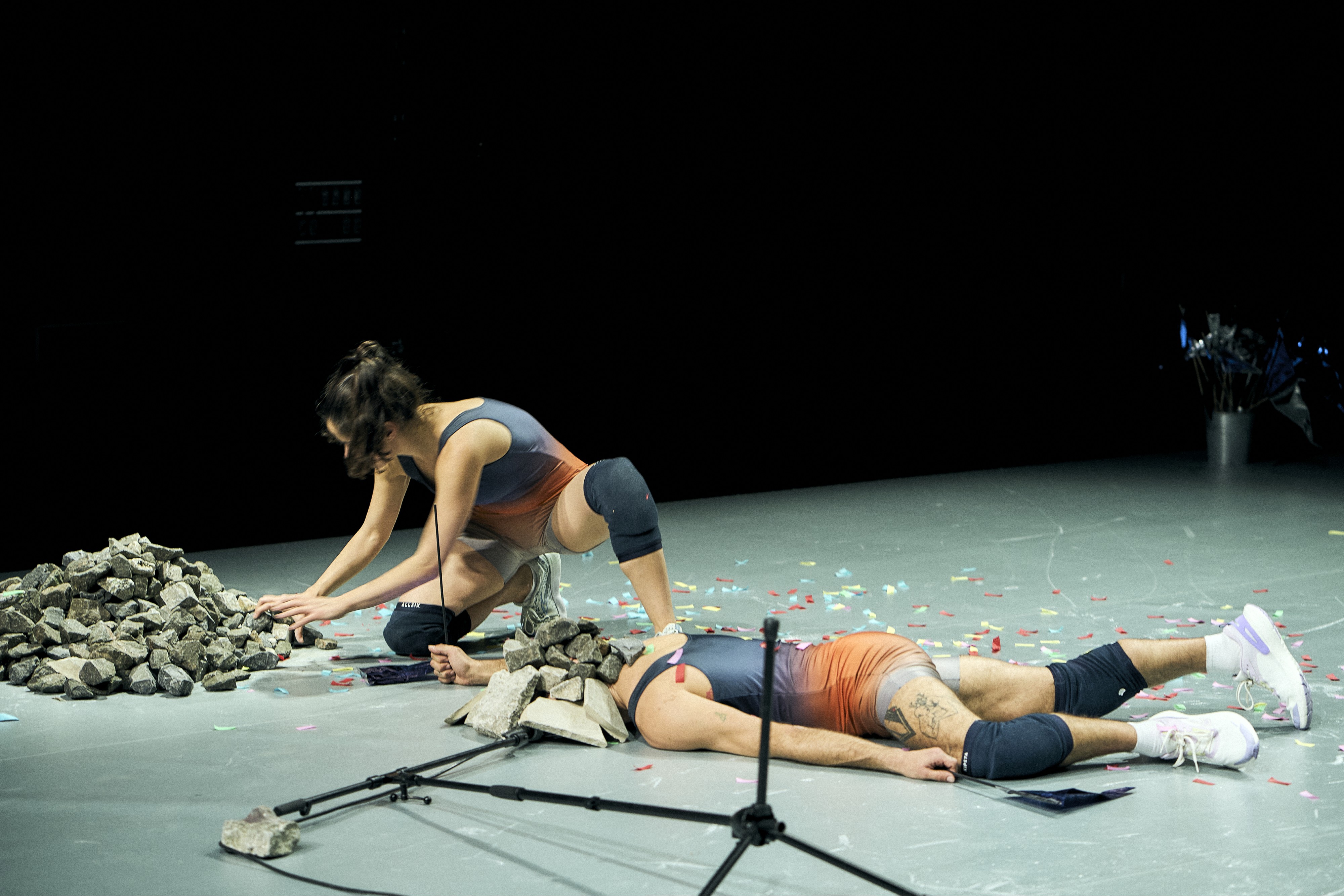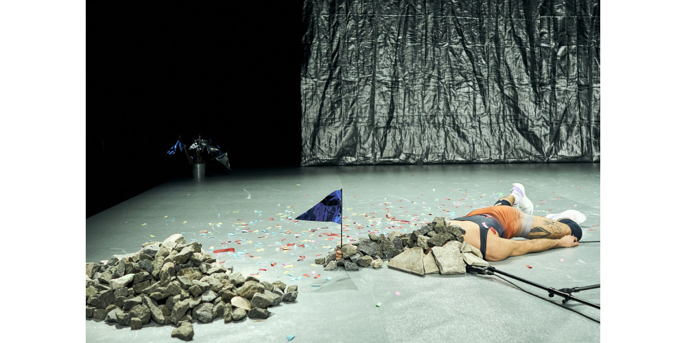 Dieses manisch-depressive Wechselspiel strukturiert „One Strike Salvation“ der Company Free Radicals, das unter anderem vom Lofft Leipzig und der Fabrik Postdam zusammen koproduziert wurde. Da begräbt Yotam Peled ihren Tänzerkollegen unter dem Schuttberg, schön akustisch verstärkt durch ein liegendes Mikrofon, und feuert alsbald eine Konfettikanone ab. Oder beide wetteifern in einer Art Kontaktimprovisation um einen silbernen Stein und üben sich dabei in seltsamen Heldenposen, die an Denkmäler erinnern lassen, aber dann doch nicht wirklich solche sind. Denn wo sah man schon einen Helden in Brückenposition, dem eine Heldin eine Hand auf die Brust legt? Eben. Und diese düsteren Phasen sind lang. Peled und Moshe zerdehnen geradezu die Zeit, lassen sich voll ein auf den melancholischen Schmerz, den sie hier ergründen und durch ihre Körper fließen lassen. Bloß um im Anschluss wieder mit Wimpeln und Konfettikanonen und irgendwann sogar auf einem silbernen Teppich durch die Lande zu ziehen.
