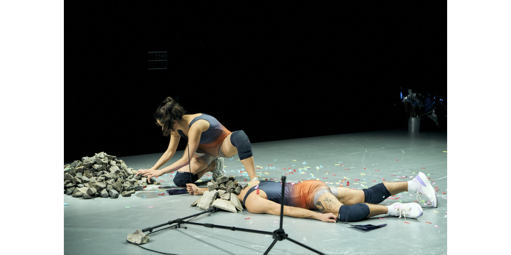 Silbern glänzt die Bühnenrückwand im Leipziger Lofft, während Nitzan Moshe vorne Schutt und Pflastersteine zu einem ansehnlich Haufen zusammenkippt. Derweil müht sich Yotam Peled, die aus der hintersten Ecke Mikrofon samt Ständer und Kabel herbeischafft, um dann dann nach langen Minuten endlich mit der Eröffnungsrede zum Abend zu beginnen. Doch leider kommt da nichts. Ein wenig Gestammel, ein paar Worte: „Maybe ... or ...“ Nein, das gesprochene Wort führt direkt ins geistige Nirvana, die Zeremonie, die hier starten sollte, ist peinlich geplatzt und versandet im Nichts. Da ergreift Moshe die Initiative und ein kleines Fähnchen, mit dem sie beginnt, über die Bühne zu kreiseln. Dazu summt sie ein Lied, und der konsternierte Peled stimmt freudig ein, und schon bald kurven beide summend und vollkommen synchron in sportiv wirkenden Bewegungen und Kostümen von Maryna Ianina, wie man sie etwa bei olympischen Eröffnungsfeiern vermutet, über die graue Bühne.