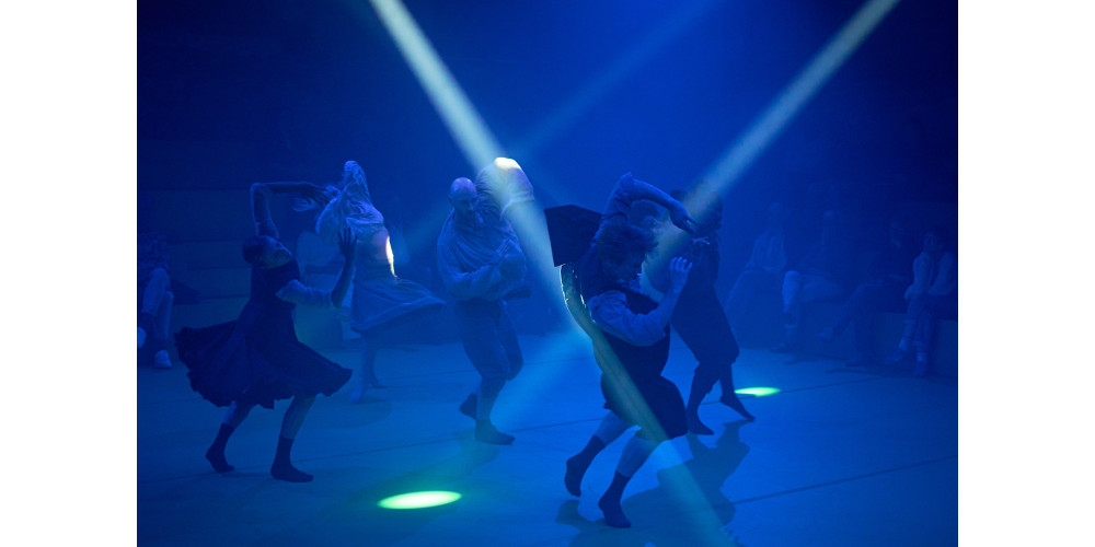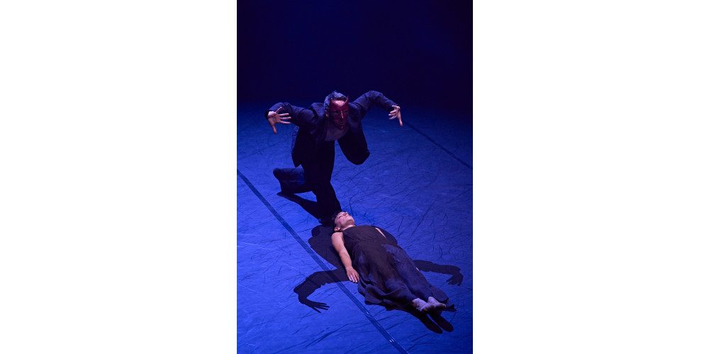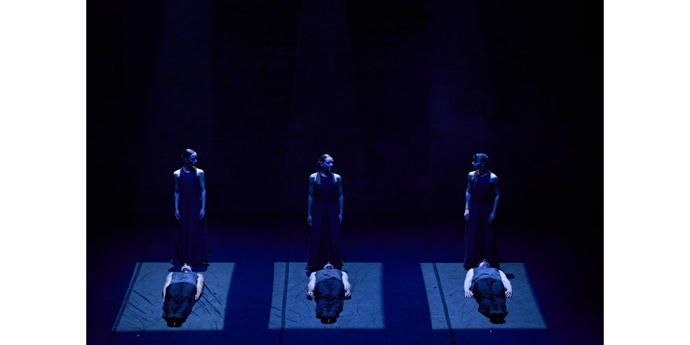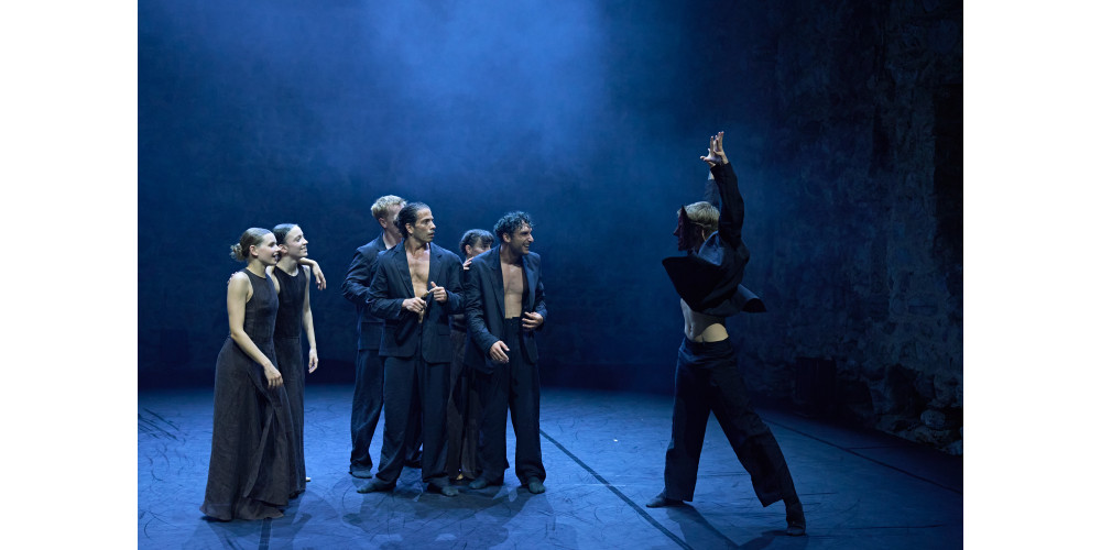 Jivoy erzählt zu Schuberts „Der Tod und das Mädchen“ mit Eleganz, großem Sinn für Ästhetik (beides zeigt sich auch in den Kostümen von Sonia Vartanian) und mit klarer Linearität eine rätoromanische Legende, in der drei Schwestern nach einem Pakt mit dem Teufel (den er selbst tanzt) ein entsetzliches Schicksal erleiden. Vor Beginn verwickeln die drei Damen (Júlia Martí-Gasull, Iria Ramirez Lafuente, Anna Soller Canet) aber erstmal Zuschauer*innen in ratsuchende Plaudereien über ihre Liebhaber (Dominic Harrison, Massimo Margaria, Ciro Tamayo). Eine kleine Augenzwinkerei, ebenso wie das unerwartet ausgestoßene „F-Wort“ an späterer Stelle.