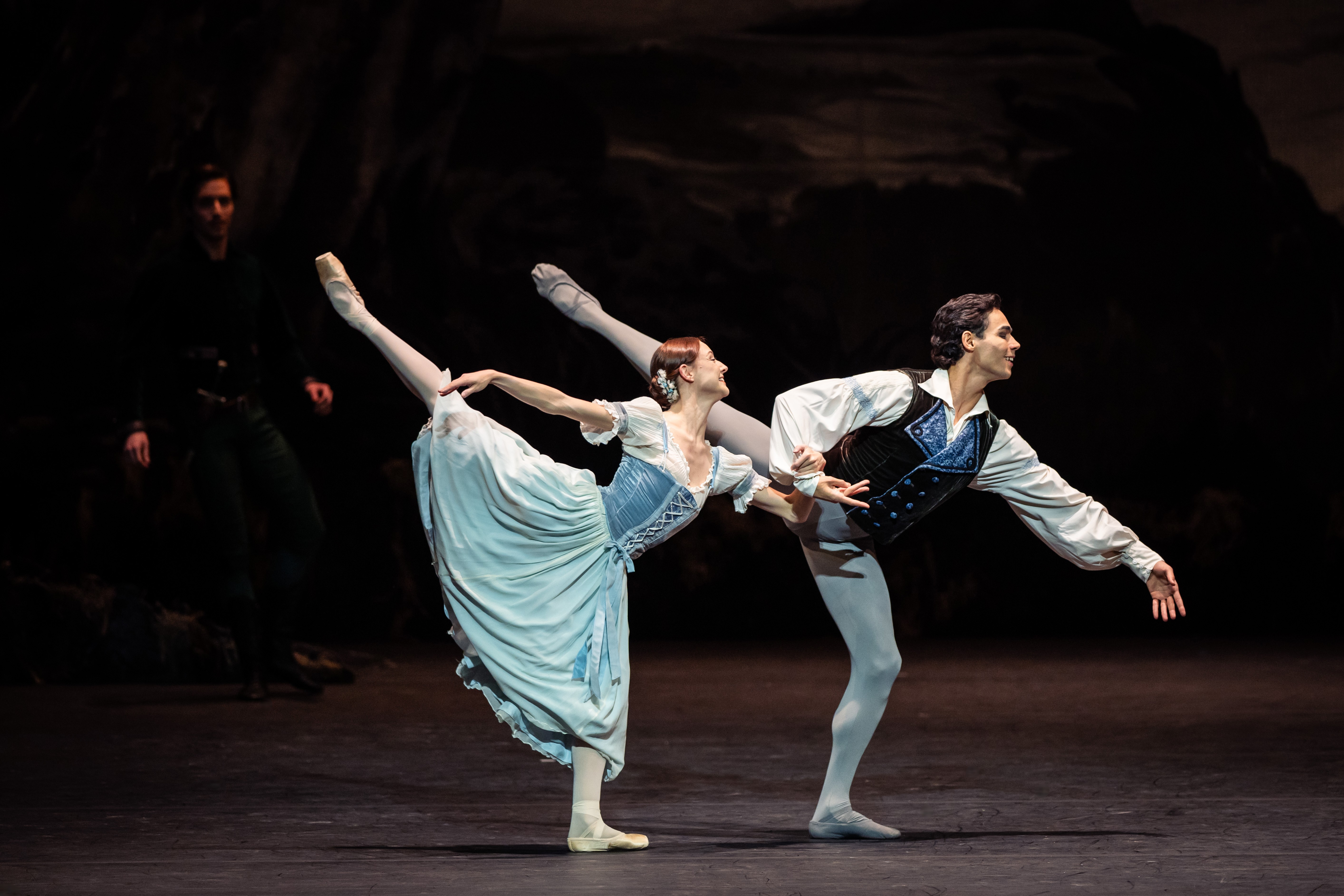 Eigentlich braucht Madison Young keinen Partner, Franziska Wagner-Hollinek als ergreifend schutzgebende Mutter Berthe ausgenommen. Das Herzergreifende im ersten Akt entzündet sich mehr angesichts des Verlobungsrings an der Hand Bathildes (Ketevan Papava) als am verdattert entlarvten Albrecht. Das Ätherische, nicht mehr Greifbare ist im zweiten Akt ihr Auftritts-Elixier, es verlässt sie keinen Moment, auch als Schutzschild für Albrecht nicht. Victor Caixeta, ein musikalisch vibrierender, genauer Tänzer voll des Rollenstudiums und scheinbar eingedenk so manchen Vorbilds, kann sich da nur betrübter Schwermut überlassen. Als dramatischer Akteur darf er viel stärker „ins Rampenlicht“ eintauchen und seine Verfasstheit als reuevoller Liebes-Betrüger in seine füllig schön getanzten Variationen einbringen. Ähnlich geht es Timoor Afsahr, der seinen ersten Hilarion in seiner ersten „Giselle“ tanzt und vor allem wie ein empathischer, eleganter, wohlfeil tanzender Compagnon der Giselle wirkt. Die Angebetete stirbt, da dürfen verzweifelte Emotionen sprühen, die Adolphe Adams Komposition aus dem Orchestergraben unter Luciano Di Martino befördert.