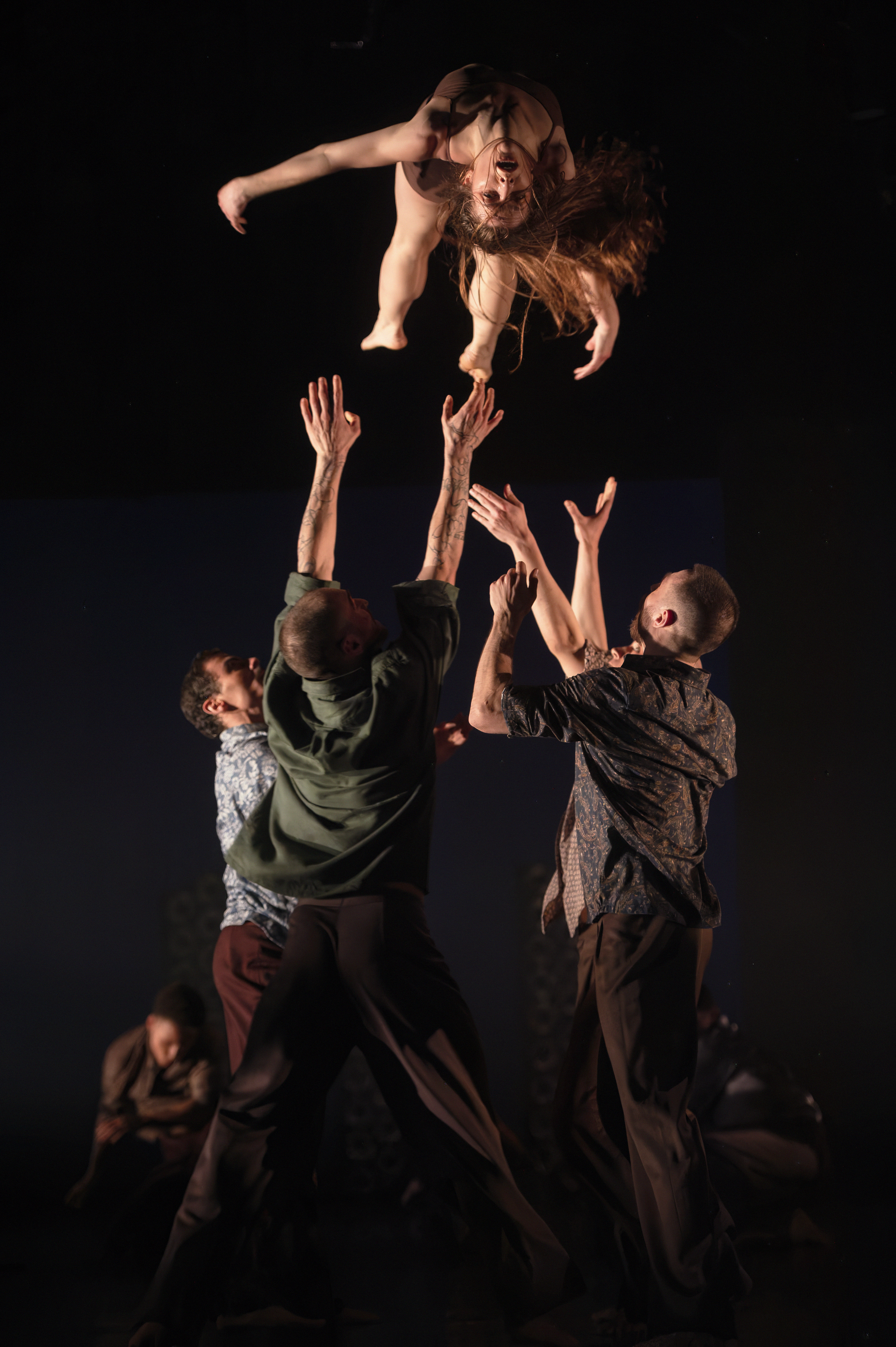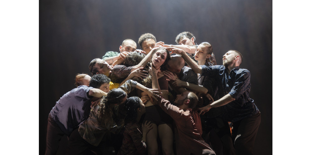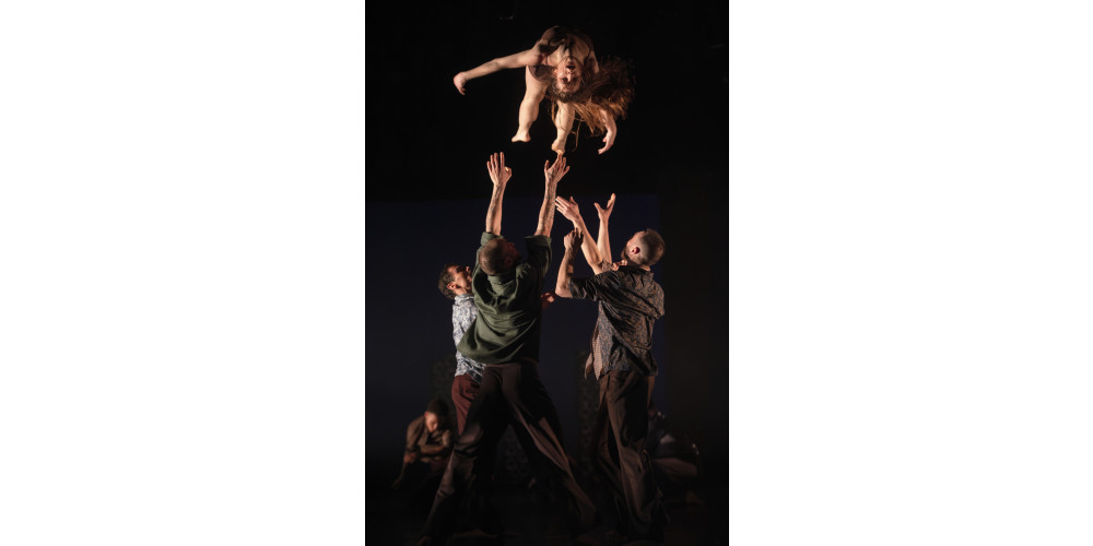 Sobald das Licht im Saal erlischt, nehmen alle dieselbe Position am Boden ein. Beine schleifen über den Boden oder ragen in die Luft. Bewegungen in Reihen treten optisch Wellen los. Die Musik (vom Band) wird zum Antrieb, und die über die ganze Bühnenfläche verteilten Interpreten rücken eng zu einem Block zusammen. Paare formieren sich. Das und wiederholtes Sich-Umklammern stärken den Zusammenhalt noch. Männer wirbeln Frauen um ihre Schultern. Partnerinnen fliegen in die Höhe. Aus zunehmend virtuoseren und impulsiveren Kreisformationen schöpft die Gemeinschaft weitere Kraft – so lange bis eine der Tänzerinnen bereit ist, sich zu opfern.