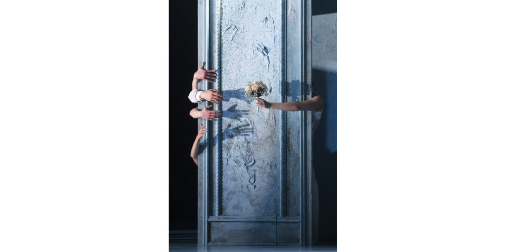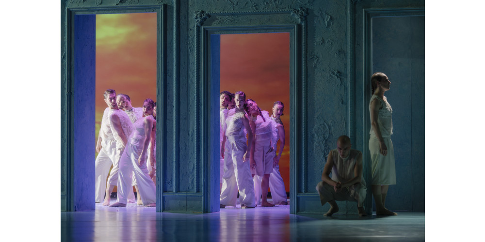 Imme Kachel hat eine hohe hellblaue Wand mit vier stuckverzierten Türöffnungen schräg in den Raum gestellt. Im Hintergrund dieses durch wenige Versatzstücke angedeuteten festlichen Partyambientes zeichnet sich der farbige Schimmer eines Sonnenuntergangs auf einem Wolkenhorizont ab. Glockenklänge sind zu hören – hinzugefügt von dem Sounddesigner Dave Price. Feierliche Stimmung soll wohl auch der verbogene Lüster über den pulsierenden Protagonist*innenströmen verbreiten, die ihre schnell changierende Gemütsgemengelage aus Aufregung, Bedenken, Vorfreude und gegenseitiger Neugierde ziemlich explosiv durch das Stück tragen.