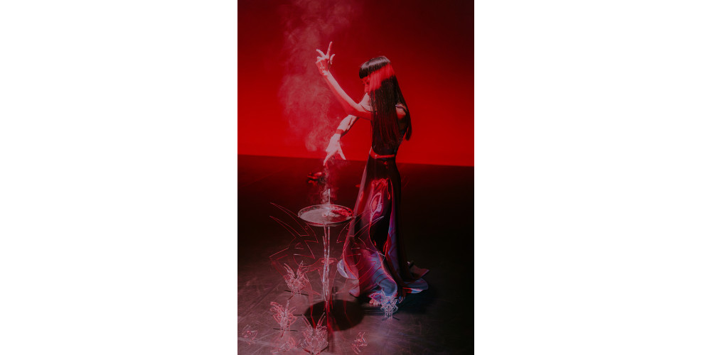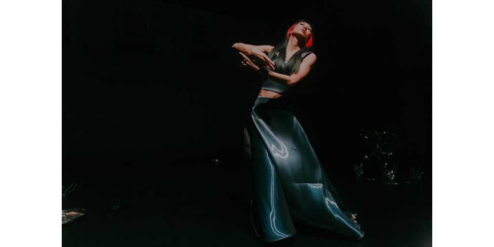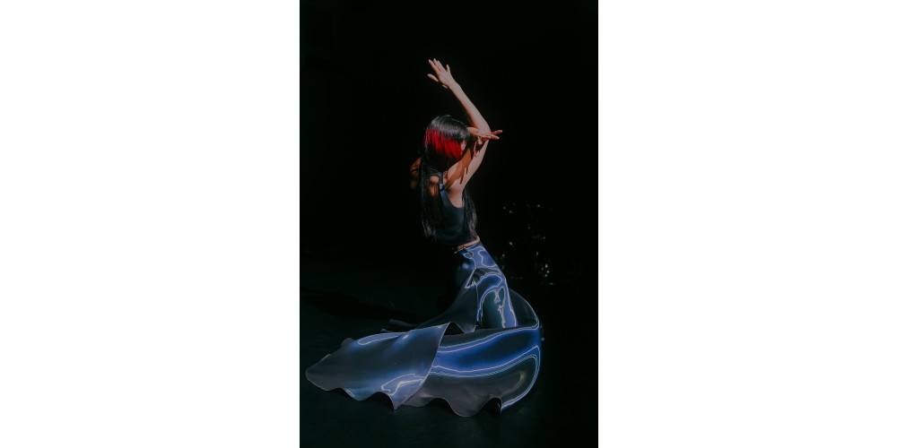 Trotz dieser schweren Themen geht man aber nach dieser Uraufführung nicht bedrückt nach Hause. Das liegt sicherlich daran, dass Cat Jimenez, die auch einen Hintergrund in Modedesign und bildender Kunst hat, großes Augenmerk auf kleine Details legt und dabei von einem tollen Team unterstützt wird. Katharina Reuschel, Wiener Couture-Designerin, kreierte aus einem dunkelblau-schwarz metallisch glänzendem Stoff einen bodenlangen Rock mit passendem Oberteil. Faszinierend ist dabei, dass der Rock steif wirkt, wenn sich Jimenez durch den Raum bewegt, aber weich, wenn sie am Boden sitzt oder liegt. Sveta Schwinn setzt für Jimenez aber auch das Kostüm und den Bühnenraum von Christiane Peschek gekonnt Lichtakzente. Die Komposition von Martin Mitterstieler sorgt für die richtige Stimmung, drängt sich aber nie in den Vordergrund.