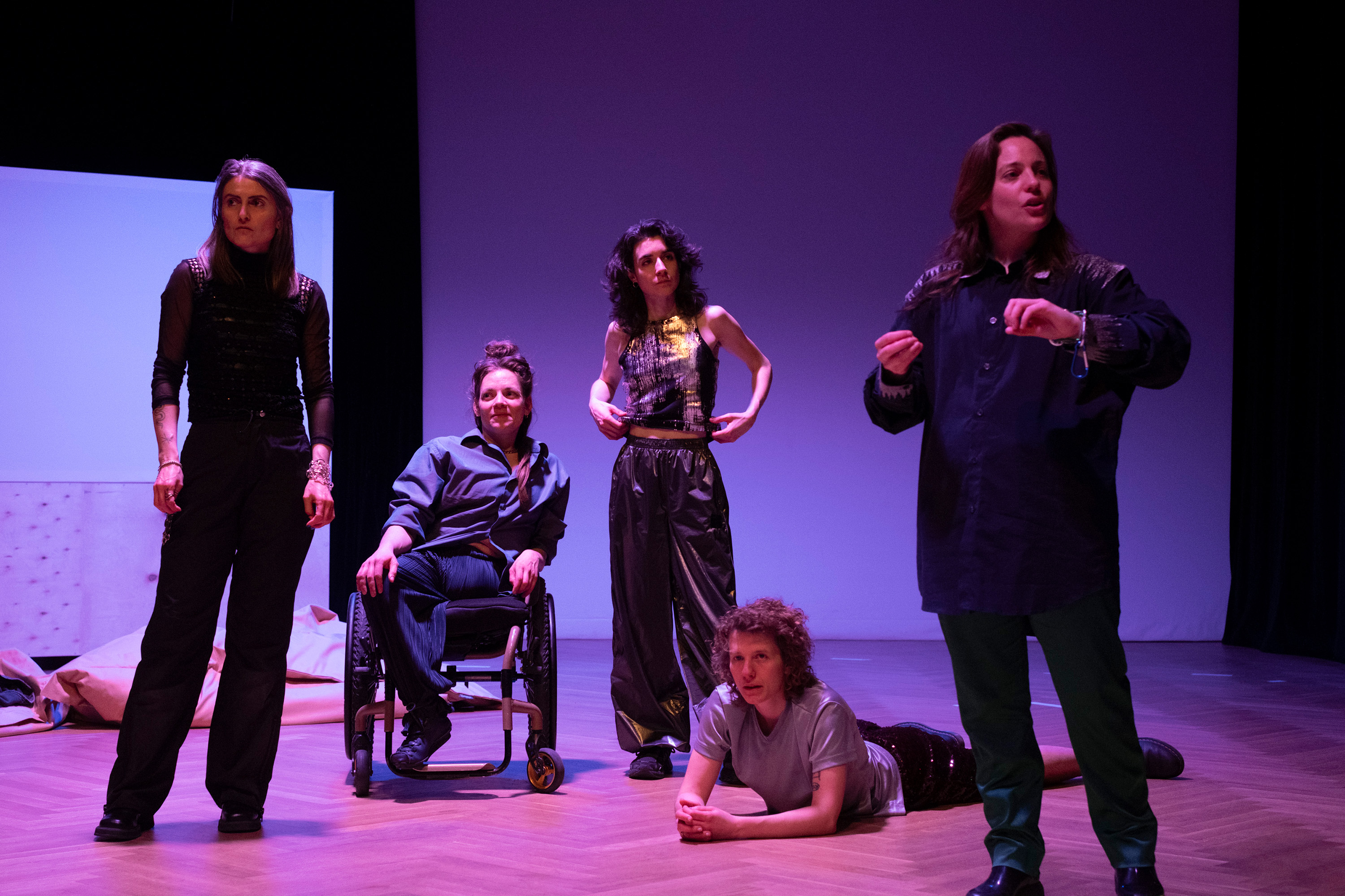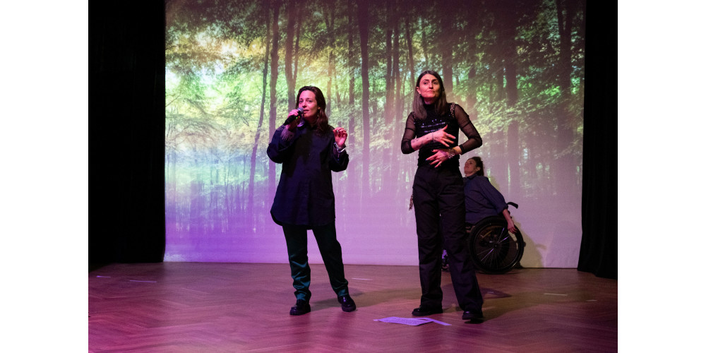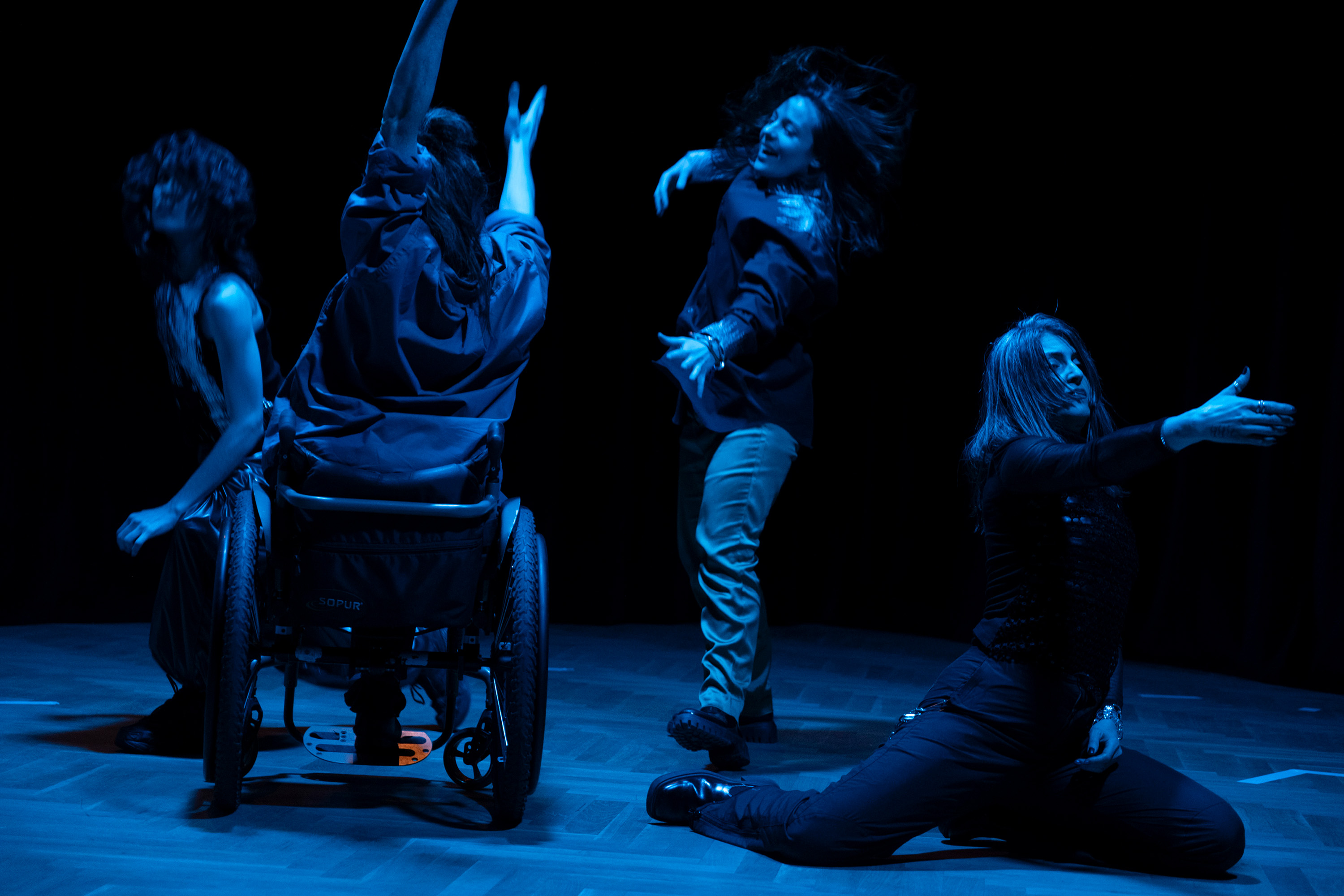 Das basisdemokratisch organisierte LIFT Tanzkollektiv (Liv Schellander, Irene Giró, Fia/Sophia Neises, Tanja Erhart) wird von der DGS-Performancekünstler*in Rita Mazza unterstützt. Somit sind „fünf Körper, vier Räder, drei mal drei Beine“ auf der Bühne zu sehen, wie es in der Audiodeskription heißt. Anfangs dominiert vor allem die Linie: Manchmal nebeneinander, manchmal hintereinander wird über die Bühne gegangen, gelaufen bzw. gefahren. Für alle hörbar wird auf Deutsch beschrieben, was gerade zu sehen ist. Dabei fällt auf, dass die Beschreibung nicht immer dem Gezeigten entspricht. Hin und wieder hat man auch das Gefühl, dass die Audiodeskription wie eine Anweisung an die Performer*innen klingt. Alle Performer*innen stellen sich einzeln vor, erzählen etwas von sich und stellen sich auch der Frage, was von einem bleiben soll, wenn man einmal nicht mehr ist. Diese Texte werden sowohl in Deutsch und Englisch übertitelt als auch in Gebärdensprache und zeichnerisch dargestellt. Danach ist das Publikum eingeladen, Gedanken zu den Zeichnungen zu teilen. Hier sorgt eine Spracherkennung für die Übertitel und automatische Übersetzung ins Englische. Dabei merkt man auch Schwächen im Verständnis des Gesagten. Aber natürlich ist die KI hilfreich, wenn kein*e Gebärdendolmetscher*in verfügbar ist.