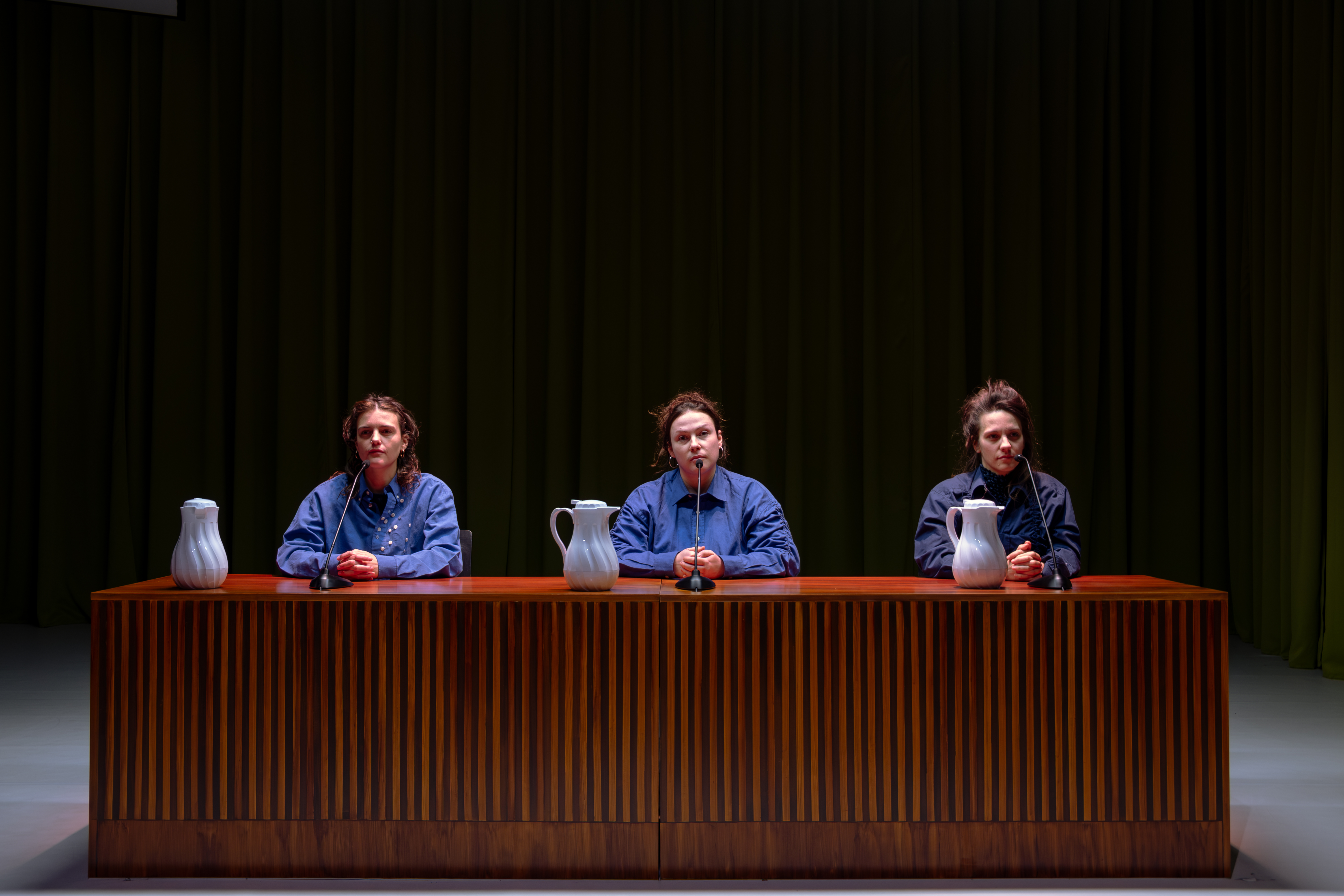 Erstmal heißt es dieselbe Pose einnehmen, um das Artikelgefeilsche und die Paragrafenmodellage nachvollziehen zu können. Wie die Sitzungspräsidentinnen der ISA verharren Helling, Sachße und Kalies hinter einem Konferenztisch und erläutern, was auf Videoausschnitten zuvor verhandelt wurde. Als sie ihr Publikum für nun fachkundig genug in Sachen Tiefseebergbau oder doch eher Tiefseeausbeutung halten, lösen sie mit synchronem Schreibtischballett den Vortrag auf. Die Kugelschreiber klicken, mit Entschlossenheit stützt man sich auf die Tischplatte, und vom Gesagten noch nicht überzeugt, lehnt man sich skeptisch auf den Stuhl zurück. Zwo, drei, vier.