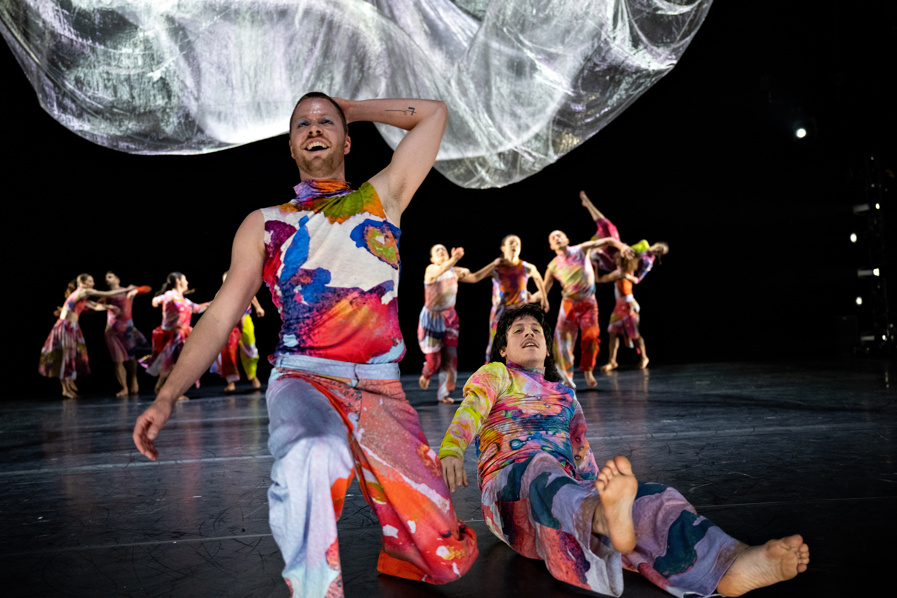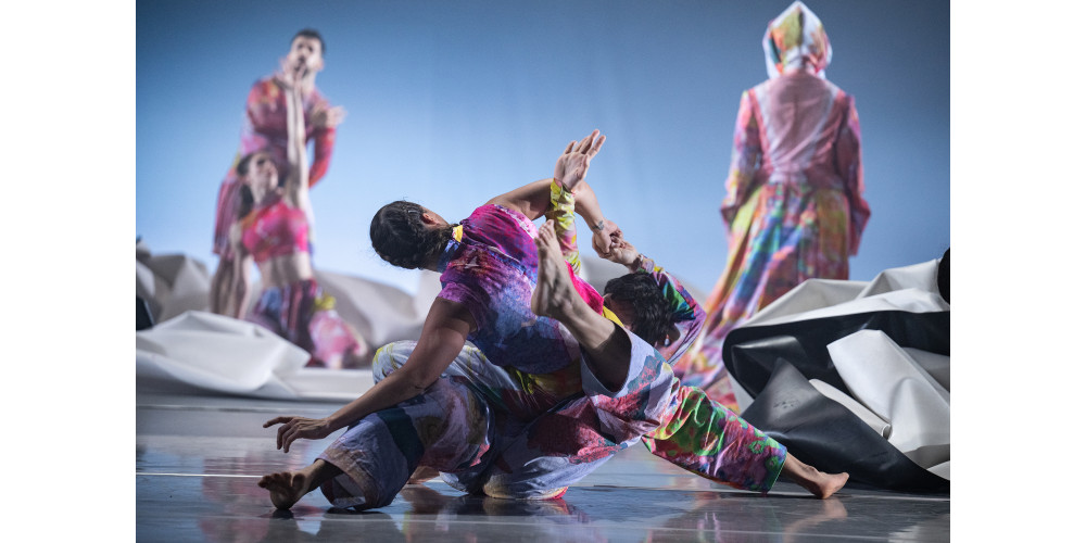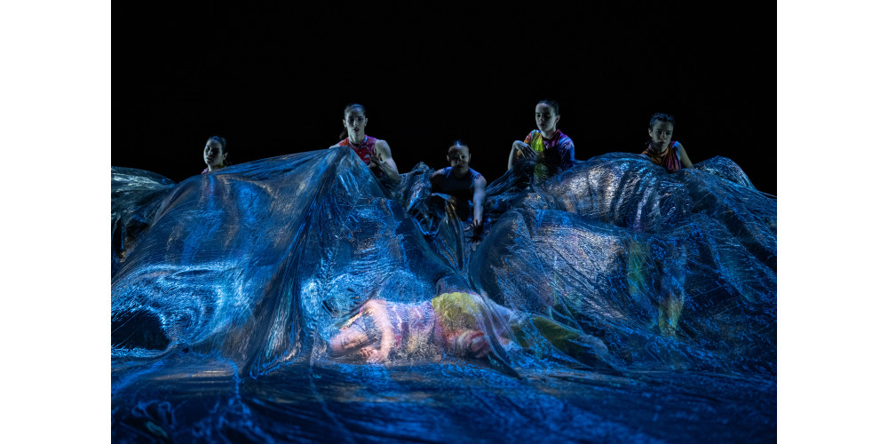 Großen Anteil daran hatte die Bühnenbildnerin Yoka Seyama, eine experimentelle Berliner Designerin mit großen Visionen; sie gestaltete zum Beispiel die Eröffnungszeremonie der EXPO 2025 in Osaka. In „Bodies of Water“ sorgte sie für Wow-Effekte mit einem hauchdünnen, durchsichtigen, spiegelnden und doch überraschend reißfesten Gewebe, das verblüffende Ähnlichkeiten mit Wasser zeigte. Die Riesenstoffbahn ließ sich von den Tänzerinnen und Tänzern in schwingende Bewegungen versetzen, entfaltete Wellen und schien zu fließen, umhüllte eine überraschend schwerelos wirkende Tänzerin und ließ sich von der Windmaschine in dramatische Wellen formen. Im zweiten Teil hing sie wie eine atmende fluide Wolke hoch über der Bühne. Erst eine bizarre Eislandschaft – geformt aus herausgerissenen Streifen des Tanzbodens – ließ das zugleich zarte und starke Gewebe erstarren. Dafür versetzte die Hebebühne sich formende Riesenstufen in einen rhythmischen Kreislauf von Auf und Ab.