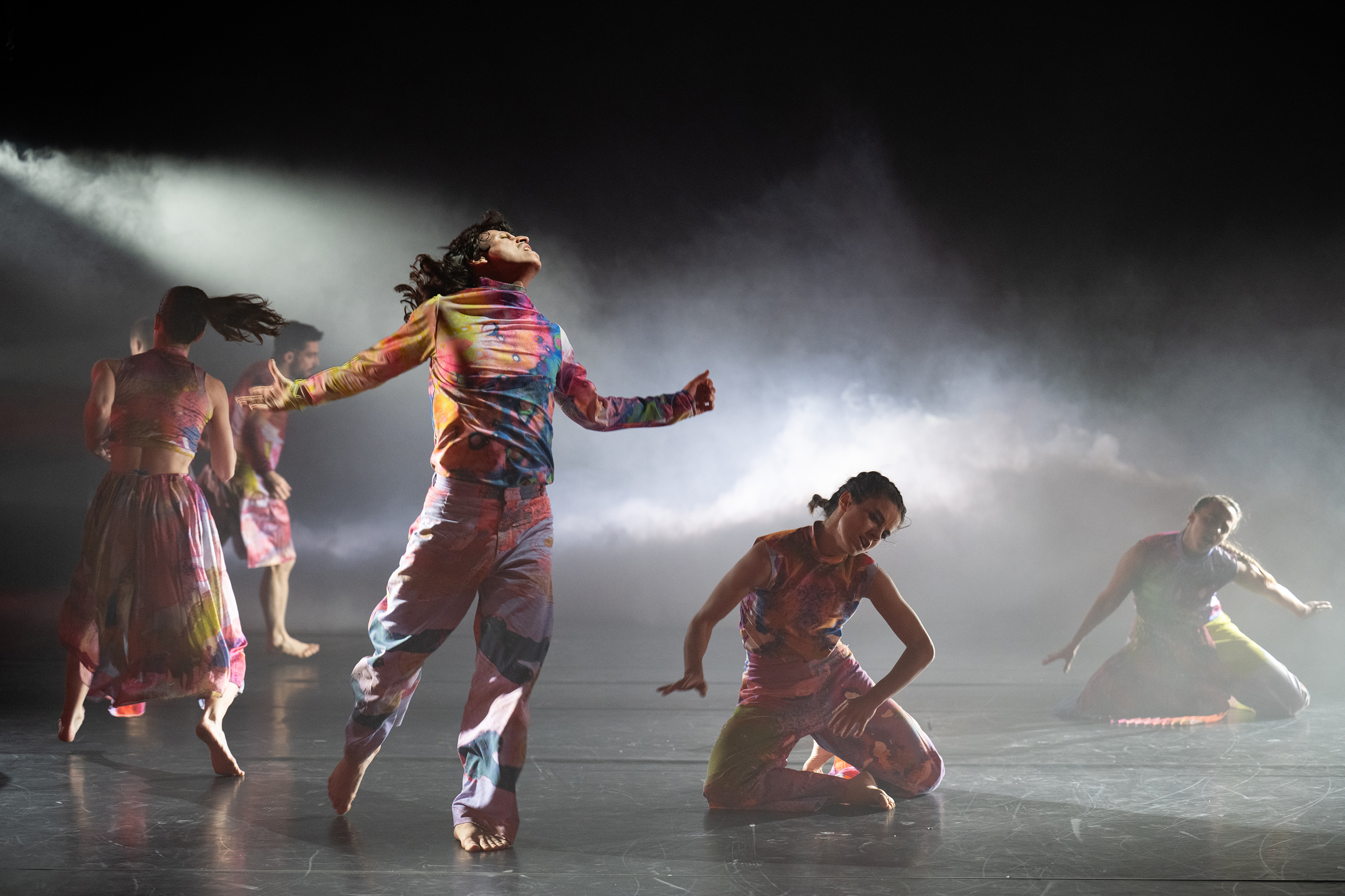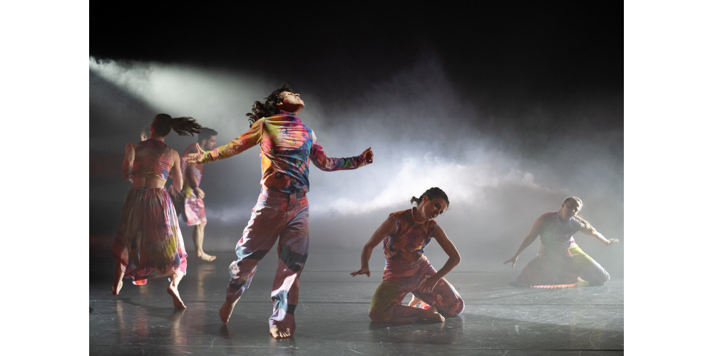 Kostümbildnerin Naomi Kean hatte sich vom inneren Flow als zentraler Eigenschaft des Wassers inspirieren lassen und die zwölf Heidelberger Tänzer*innen individuell abgestimmt in farbenfrohen Mustermix mit viel Pink gehüllt, bequem und nur angedeutet sexy. Viel Bewegungsfreiheit für ein Bewegungsmaterial, für das sich Iván Pérez gründlich von den Eigenschaften der nassen Materie hatte inspirieren lassen. Immer scheinen die Körper regelrecht zu fließen, gerne in Zeitlupe; sie winden sich in Körperknäueln, trennen und verbinden sich wieder neu. Auch die Musik startet mit unaufdringlichem Fließen, einem allmählich anschwellenden elektronischen Klangteppich, der bei der Änderung der Aggregatzustände des Wassers – und natürlich beim obligatorischen Sturm – in eindringliche rhythmische Wucht wechselt.