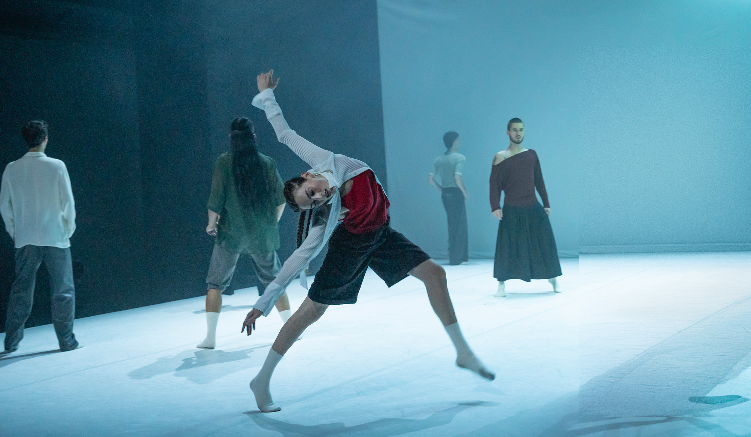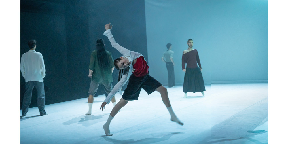 Die Bewegungen sind ruhig, kontrolliert, scheinbar organisch. Begleitet von percussionreicher Musik (Toto Bissainthe, Divan Gattamorta, Simon Mayer, Serge Weber; Bearbeitung: Aholou-Wokawui) bewegen sich die Tänzer*innen, einheitlich in blaue Stoffhosen gekleidet, im Einklang, lösen sich aus Formationen und finden wieder zurück, ohne je ins Chaos zu kippen. Die Abläufe wirken ritualisiert, als folge jede Geste einer inneren Ordnung. Die Körper scheinen noch vom Schlaf durchzogen. Bewegungen entstehen tastend, breiten sich aus, versickern wieder. Immer wieder entstehen Momente des Dazwischen – zwischen innerer Empfindung und äußerer Realität.