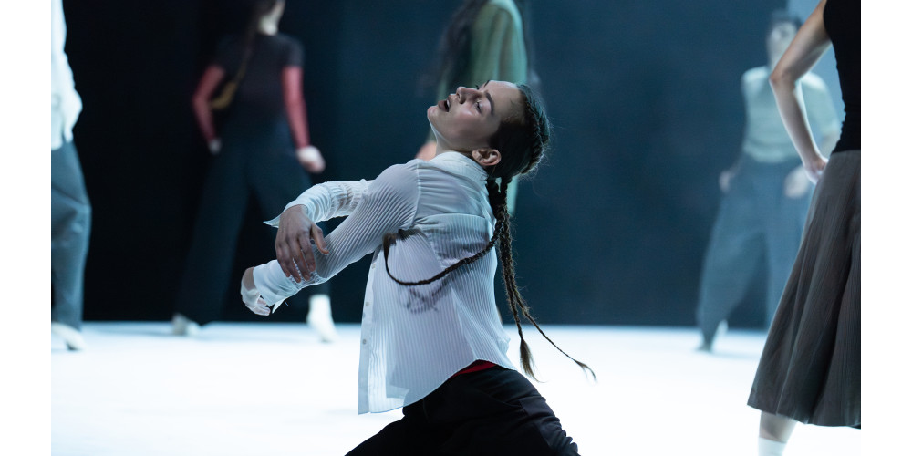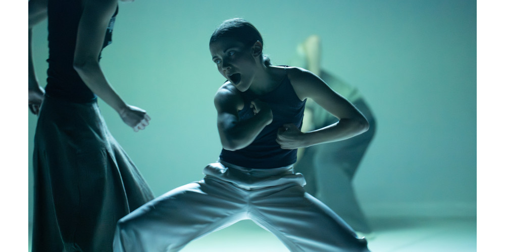 Bereits zu Beginn der Uraufführung liegt eine latente Spannung im Raum. Ein dunkles Quadrat im Zentrum fungiert als visuelles und dramaturgisches Kraftfeld. Eine Tänzerin sitzt darauf, allein, scheinbar lautlos schreiend – ein Bild unmittelbarer Unruhe.