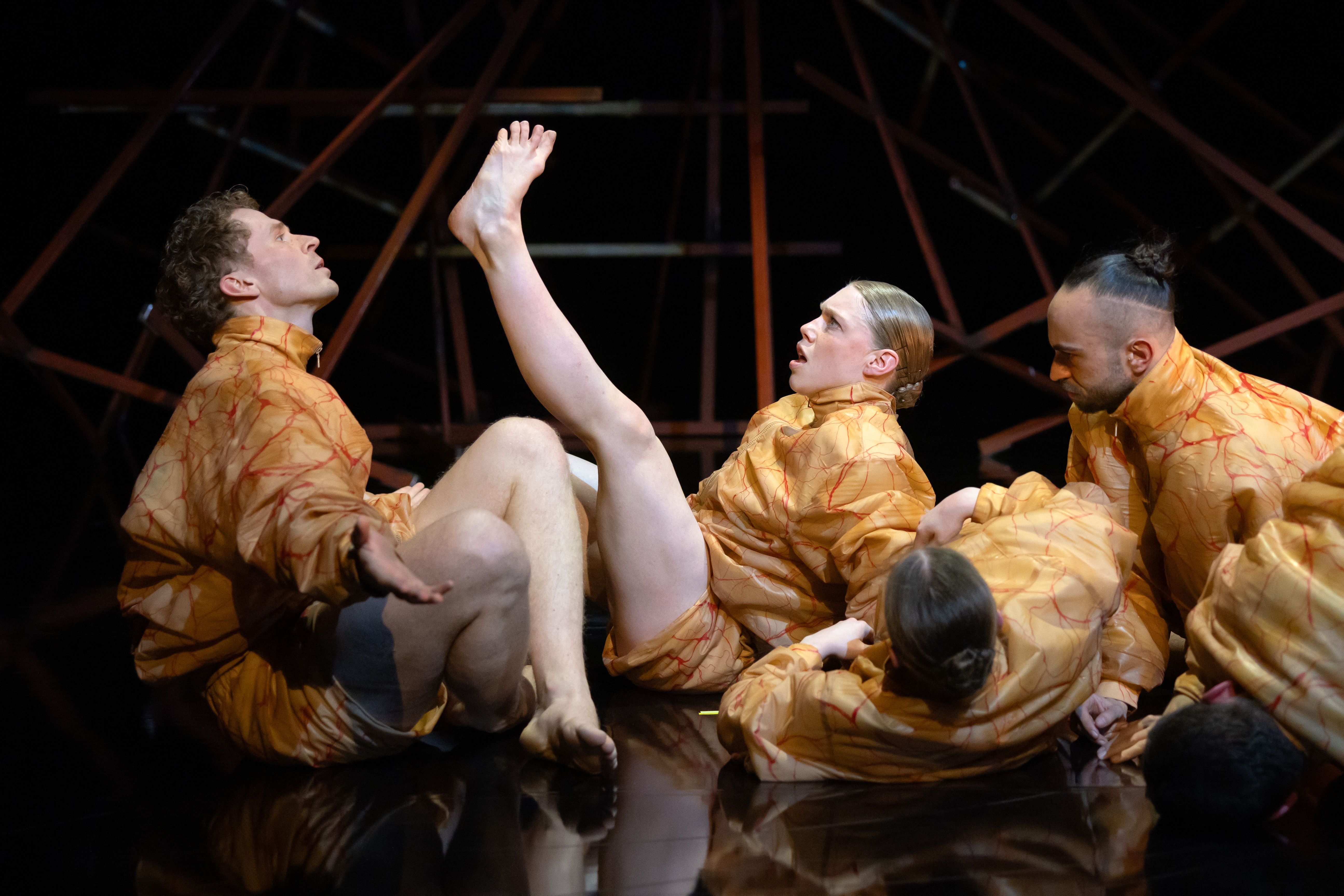 Die in Oslo ansässige Hege Haagenrud ist eine akribische Sammlerin von Textfragmenten, die sie aus den Medien fischt und in ihren Arbeiten verwendet. So auch in „Safe Space“, diesem neuen Werk für fünf Tänzer*innen, dem die Lippensynchronisation seine besondere Spannung verleiht. Düster beginnt es, in Leere und Dunkelheit, mit dem Urknall, der Keimzelle ist für alles, was kommen wird. Der erste Mensch findet seine Genoss*innen, alle entschrauben sich in ihren wulstigen orangefarbenen Oberteilen (die Kostüme sind von Haagenrud selbst) langsam aus dem amorphen Knäuel, das sie am Boden bilden und finden sich dann in einem an eine Selbsthilfegruppe erinnernden Zusammensein.