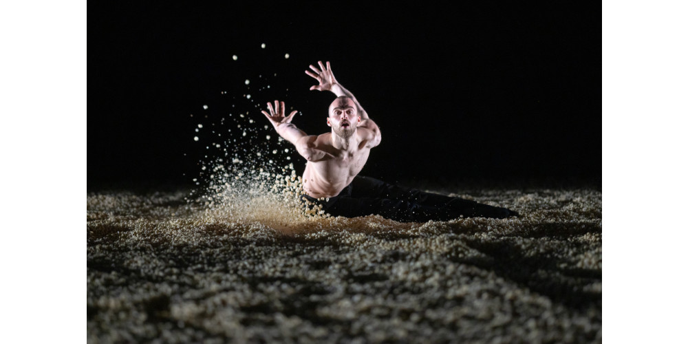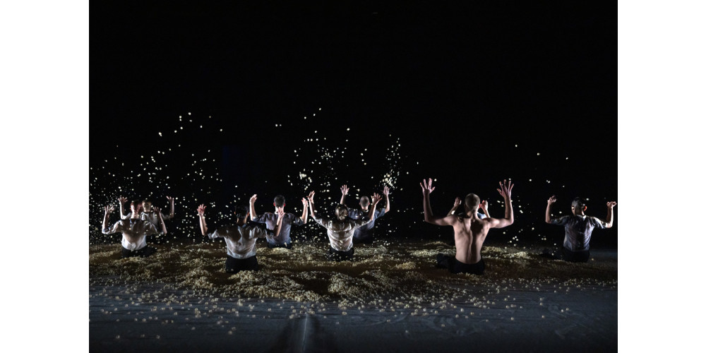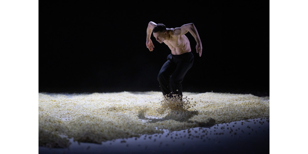 Ein riesiges Herz aus Popcorn bedeckt den Bühnenboden. Es hat etwas Versöhnliches, das es hier wie eine Metapher für unser Universum steht, auf das sich, anders als in dem ersten Stück, die die zwölf Tänzer*innen nicht mit einer Innenperspektive zubewegen, sondern von außen. Wie Aliens umkreisen sie flirrend das Herz, bis Toshitaka Nakamura – im Wortsinn beherzt – mit einem Sprung dessen harmonische Form sprengt: der Anfang einer Auflösung. Atemlos erobern sich die Tänzer*innen diesen Raum. Oder versuchen sie, ihm oder etwas zu entkommen, so wie es geduckt Andrey Alves zu versuchen scheint oder Mari Ishida in ihrem Solo zu leicht bedrohlich wabernden Wortfetzen?