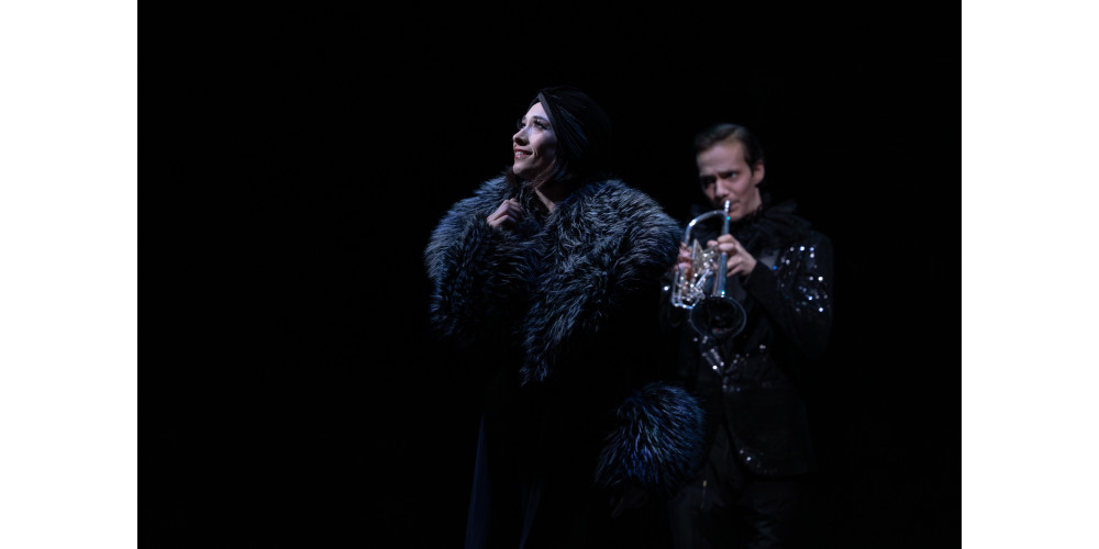 Akustisch sind die Ebenen voneinander getrennt. In einer eigenen Komposition vermischen sich Trompete (live: Sami Lab) mit elektronischen Klängen (live am DJ-Pult: Damian Ibn Salem). Die Erzählebenen verschwimmen irgendwann. Vogelgezwitscher wird plötzlich rhythmisch; Sami Lab spielt James P. Johnsons berühmte „Charleston“-Melodie, auf die sich digitale Beats legen. Und das dann auf Spitze getanzt. Ein grotesker Traum!
