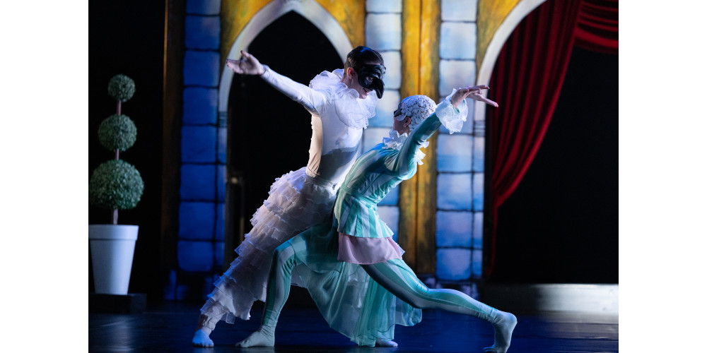 Ghalumyan lässt sein „Pulcinella“ in der ursprünglichen Handlung mit ganz klassischen Commedia dell’arte-Kostümen (Julia Dietrich) beginnen. Die neckischen Tändeleien zwischen Liebe und Eifersucht sind entsprechend harmlos und mit kleinen Späßen gespickt. Genau in jenem Moment aber, in dem Pulcinella verprügelt werden soll, bricht die Handlung ab. Das Stück verzichtet komplett auf den Gewaltakt, das Bühnenbild dreht sich auf seine Rückseite, und mit einem Kostümwechsel findet sich das Ensemble im Probensaal wieder. Dort wird natürlich „Pulcinella“ geprobt. Auffällig ist, dass Ghalumyan hier im Hauptteil seiner Choreografie auch seinen Stil ändert und auf Spitze choreografiert.
