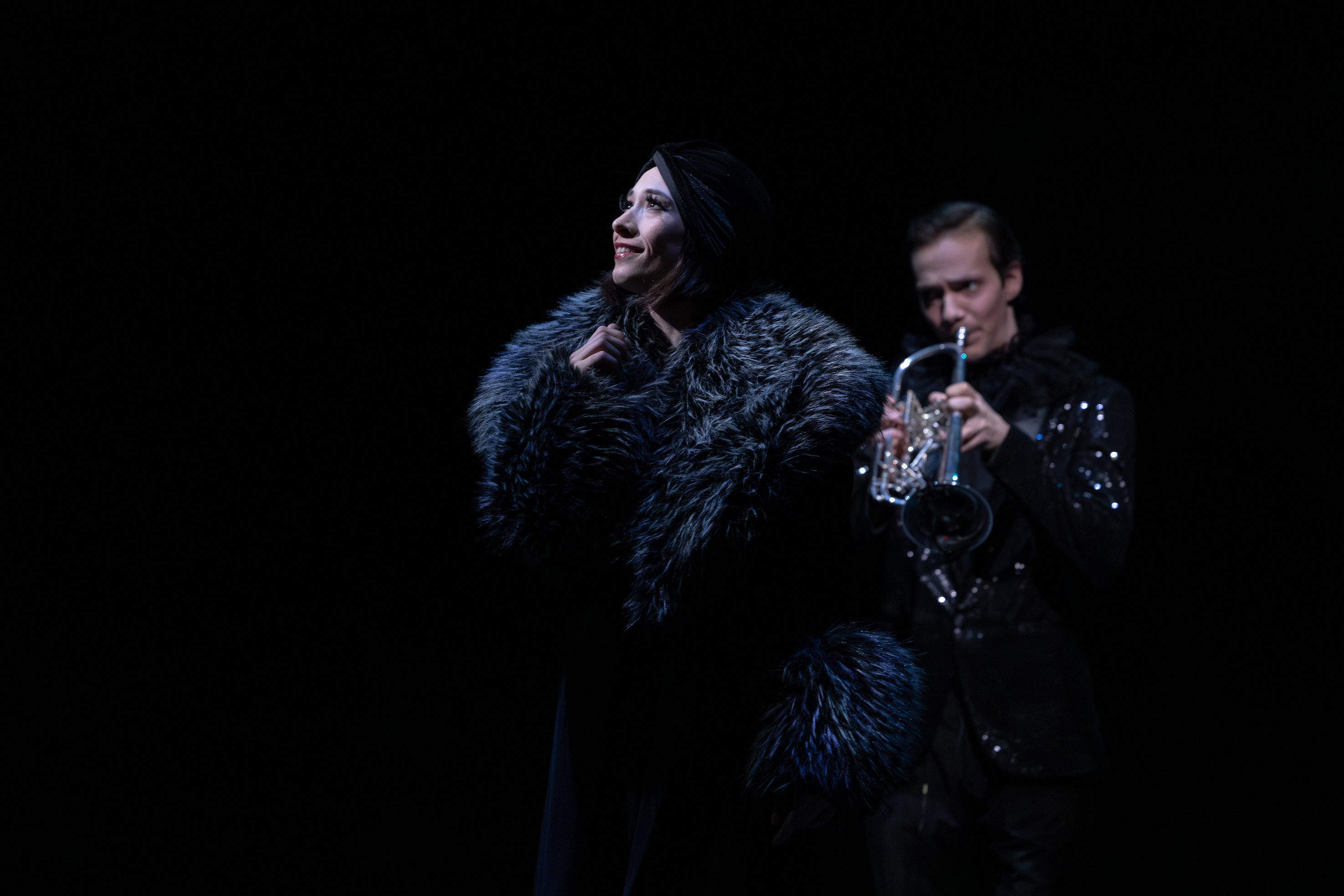 Vor diesem Stück mit hohem technischen Anspruch kam „Pulcinella“ in der Choreografie des Armeniers Arshak Ghalumyan. Der verpasst der Handlung aus der Commedia dell‘arte eine Klammer mit einer zusätzlichen Handlungsebene: Er geht zurück in die Ballettgeschichte Geras und lässt Yvonne Georgi (Jéssyca Helena Rett) wiederbeleben. Diese hatte unter Kurt Jooss in Münster getanzt, bevor sie 1925 in Gera die Leitung des Reußischen Theaters übernahm. Dort choreografierte sie ein Jahr später Strawinskys „Pulcinella“. Dessen Musik bildet musikalisch den gemeinsamen Überbau beider Stücke.