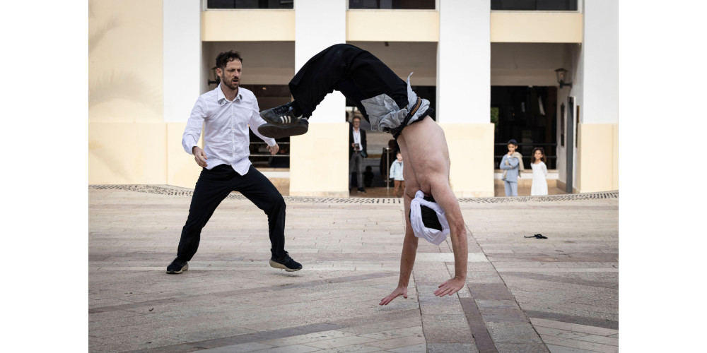 Wechsel zur „Jerusalem Dance Week“, dem Festival für die kleineren Formate. Das „Machol Shalem Dance House“, das hier Gastgeber ist, residiert in einem ehemaligen Kino, das wiederum in einem Einkaufszentrum in den Außenbezirken Jerusalems liegt. Niemand würde hier eine Spielstätte für Avantgarde-Tanz vermuten. Politisch geht es da weiter, wo man in Tel Aviv aufgehört hatte – mit Zweikämpfen.