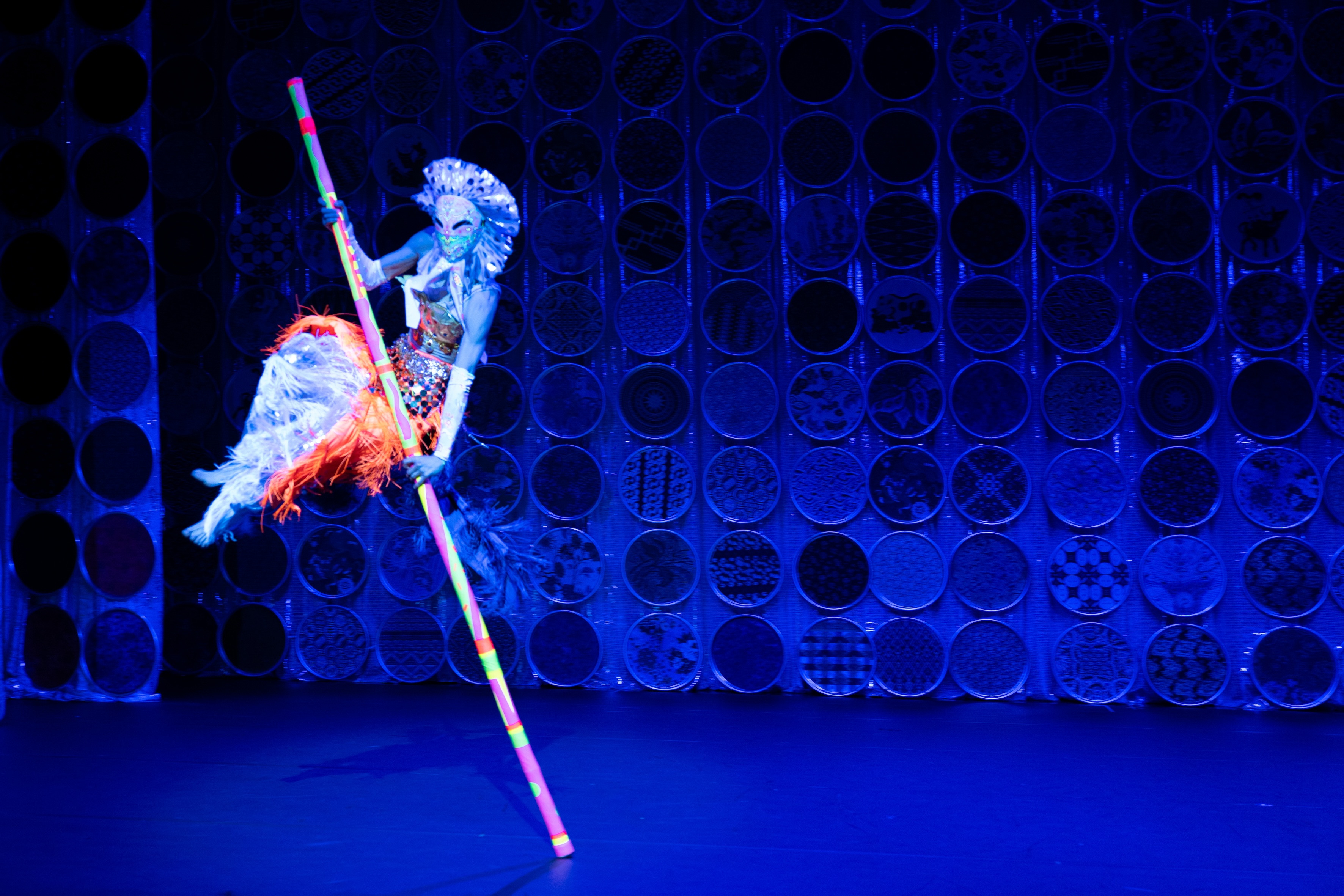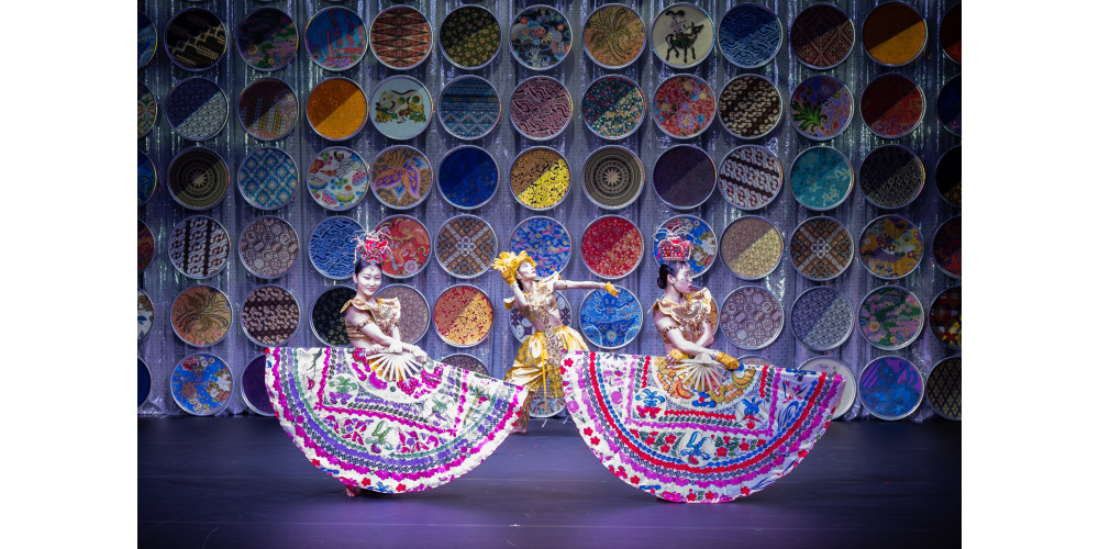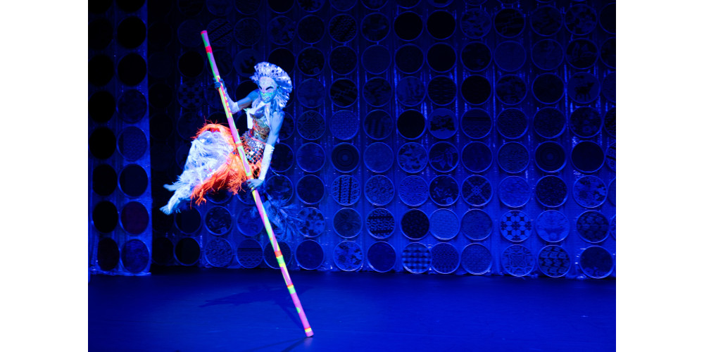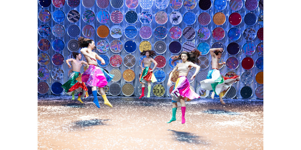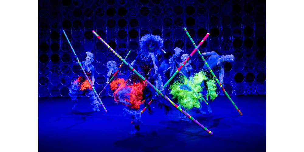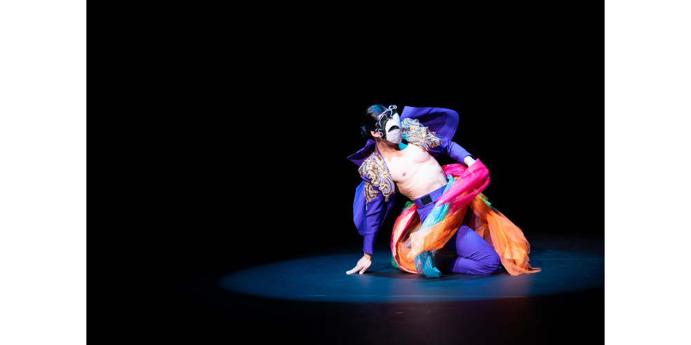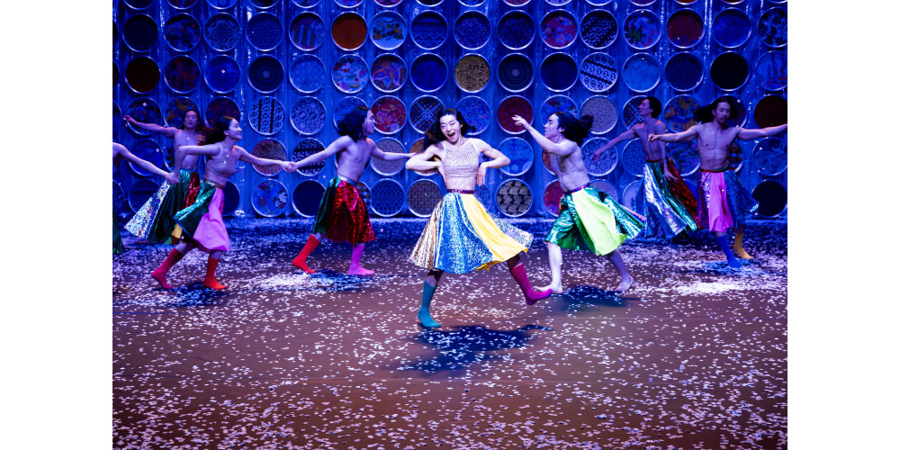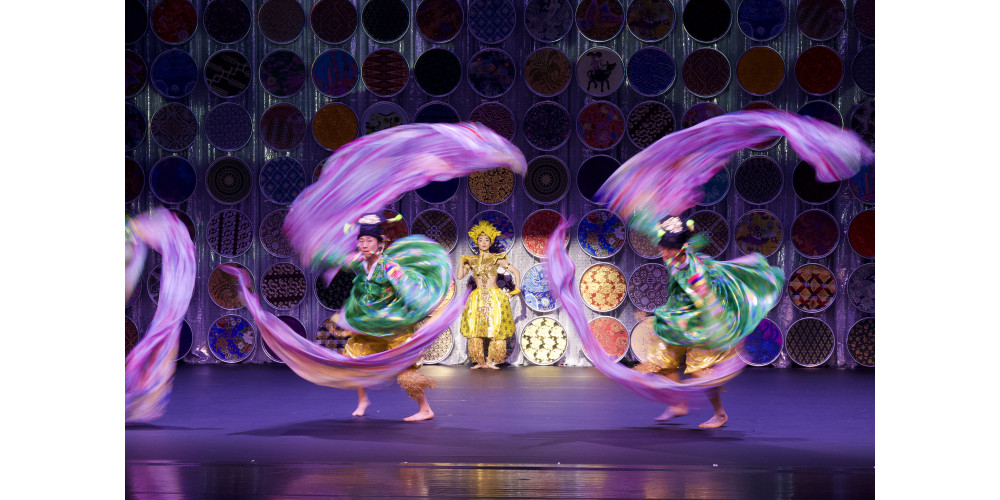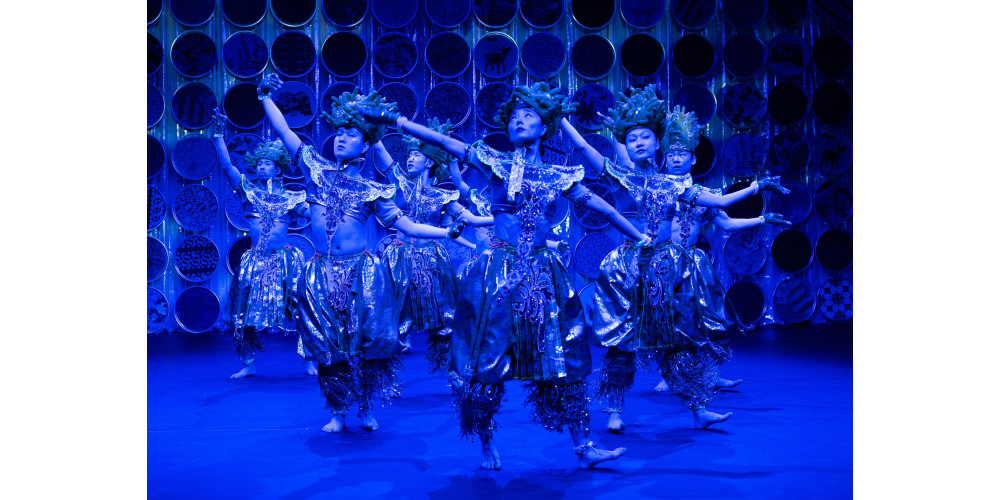 Es ist der Beginn eines 80-minütigen Spektakels, in dem eine fantasievoll kostümierte Gestalt nach der anderen über die Bühne wirbelt, drei Frauen und vier Männer, immer mit Bezug auf das Orientalische und Fernöstliche, auf kulturelle Traditionen in Indien, Thailand, China, Japan, Korea. Es gibt Schlangenbeschwörungen, indische Tempeltänze, Elemente des japanischen Nô-Theaters oder auch fulminante akrobatische Variationen – in ständig wechselnden, prachtvollen Kostümen. Backstage muss das generalstabsmäßig organisiert sein, rasend schnell gehen die Wechsel, üppig ist oft der Kopfschmuck; einmal schwingen sich zwei Tänzer sogar auf Schemel-Stelzen über die Bühne. Manchmal erscheinen die Tänzer*innen wie menschliche Flummis, deren Körper offenbar alles aushalten können, egal, wie sie sich über den Boden werfen oder um andere Körper herumwickeln.