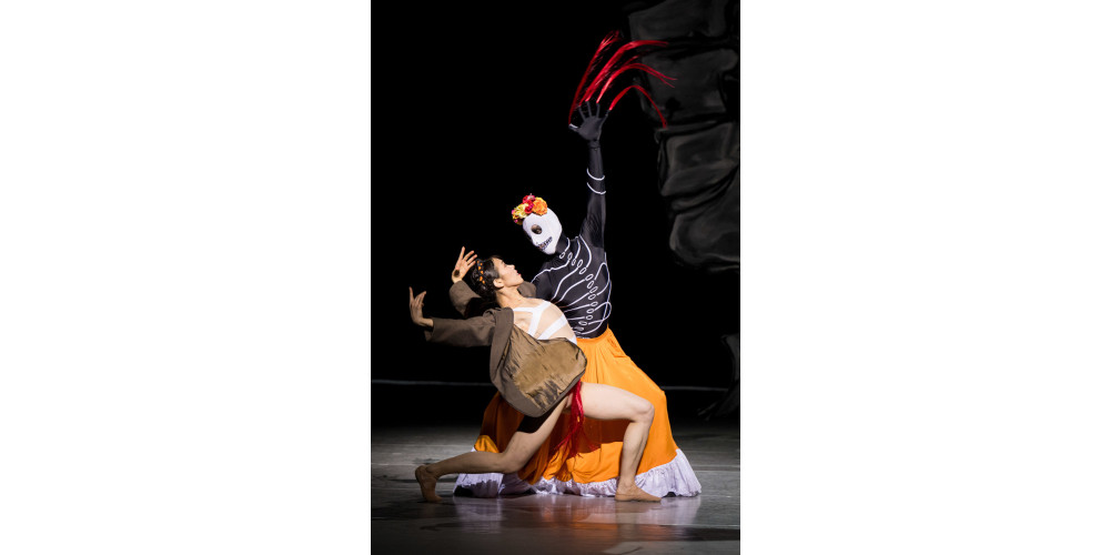 Leuchtende Farben auf der Bühne und in den Tehuana-Kleidern, Symbole kulturellen Stolzes und feministischer Identität, schaffen eine durchdachte Ästhetik, die den perfekten Rahmen für Annabelle Lopez Ochoas präzise Choreografie bildet. In enger Verbindung mit der Musik von Peter Salem und Chavela Vargas verleiht ihr teils verfremdetes klassisches Bewegungsvokabular den Figuren einen einzigartigen Charakter: In der subtilen Interpretation von Sae Tamura erscheint Frida mal verspielt und lebhaft, mal von inneren Qualen gezeichnet. In den Pas de deux werden die stürmischen Beziehungen zwischen Frida Kahlo und Diego Rivera und ihre jeweiligen Affären dargestellt. Symmetrische Formationen und zahlreiche Hebefiguren verleihen den Momenten der Freude, von denen es trotz des tragischen Schicksals der Ikone viele gibt, immer wieder Auftrieb. „Frida“ stellt Virtuosität in den Dienst der Erzählung.