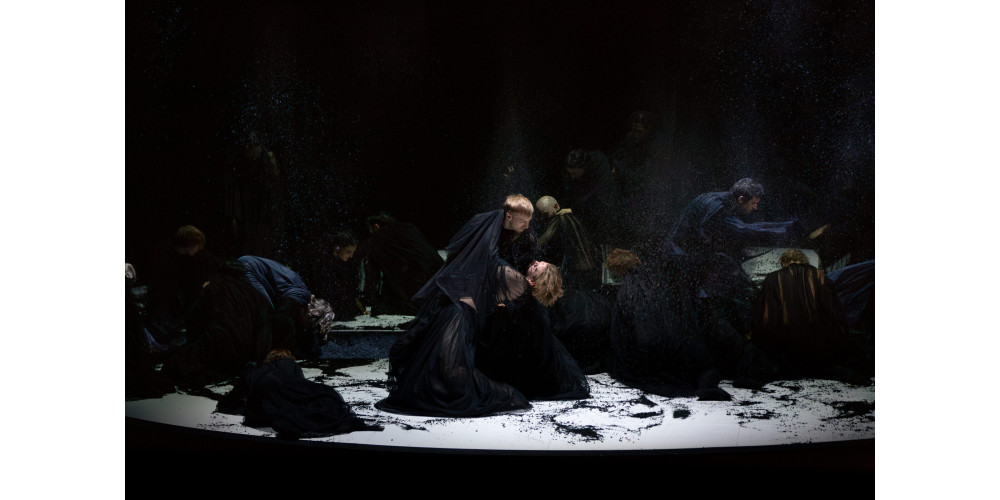Nach einem packenden Entrée, in dem sich die ganz in Schwarz gewandete Tänzer*innenmenge in der Dunkelheit auf die Bühne schiebt, um sich daraufhin in einer Kreisform aufzuhalten, verschieben sich die darstellerischen Mittel geringfügig. Als würde der Bildgestalter seine gesetzten Figuren nur noch verrühren und in einem Gemetzel um Leben und Tod enden lassen. Ein Best of-Prokofjew läuft vorbei, offenbar können Alle Romeo und Julia sein in dem dichten dunklen Gedränge. Nur die Unschuld zweier Kinder bleibt menschlich.