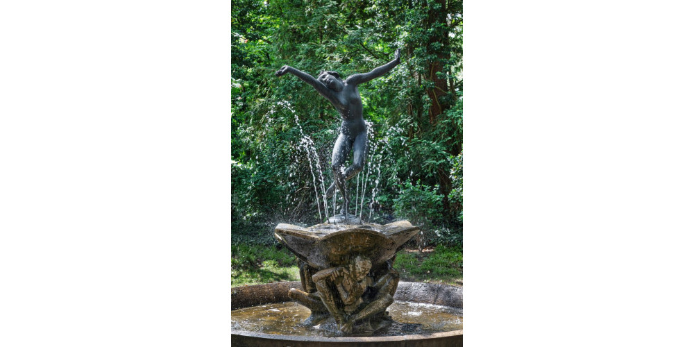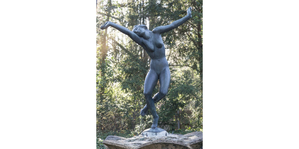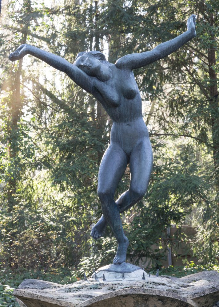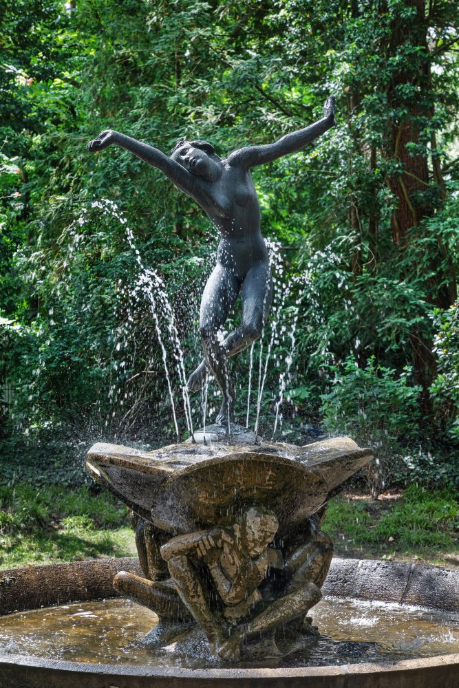 Der „Tänzerinnen-Brunnen“ im Garten des Georg Kolbe Museums steht, hat eine nicht ganz unproblematische Geschichte. Georg Kolbe hat ihn 1922 im Auftrag des Kunstsammlers Heinrich Stahl, dem Vorsitzenden der Jüdischen Gemeinde, für seine Villa erschaffen. Stahl kam im KZ Theresienstadt um, sein Haus mit dem Brunnen musste er vor der Deportation veräußern. Nach dem Krieg blieb der abgebaute Brunnen bis 1979 verschollen. 2001 verzichtet der Werner Stahl, der Enkel Heinrich Stahls, auf das Erbe des Brunnen, der damit in den Besitz des Georg Kolbe Museums in Berlin überging. Seit 2023 arbeitet Kathleen Reinhardt im Rahmen des Projekts „The Fountain“ die Geschichte des Objekts auf.
