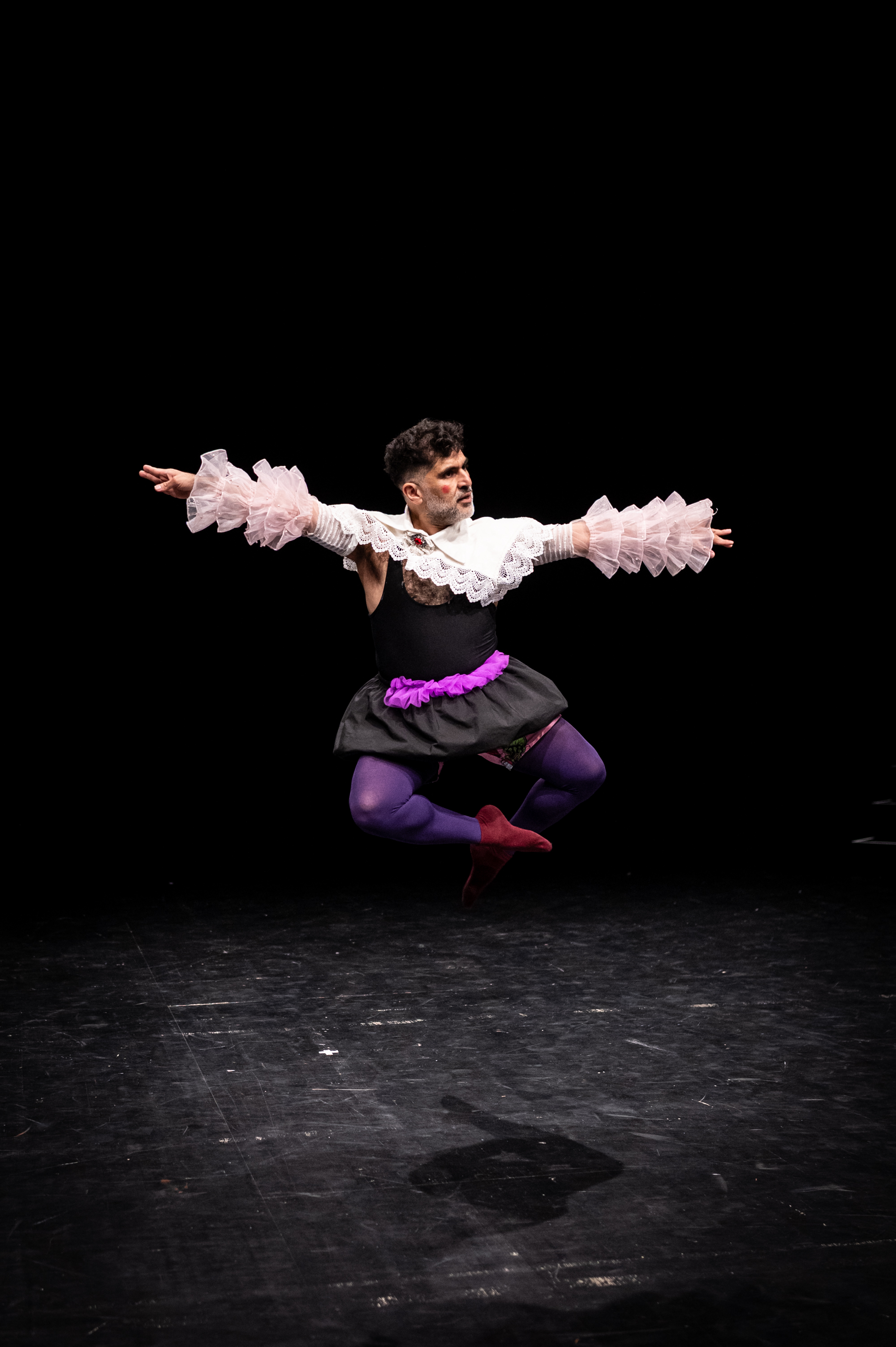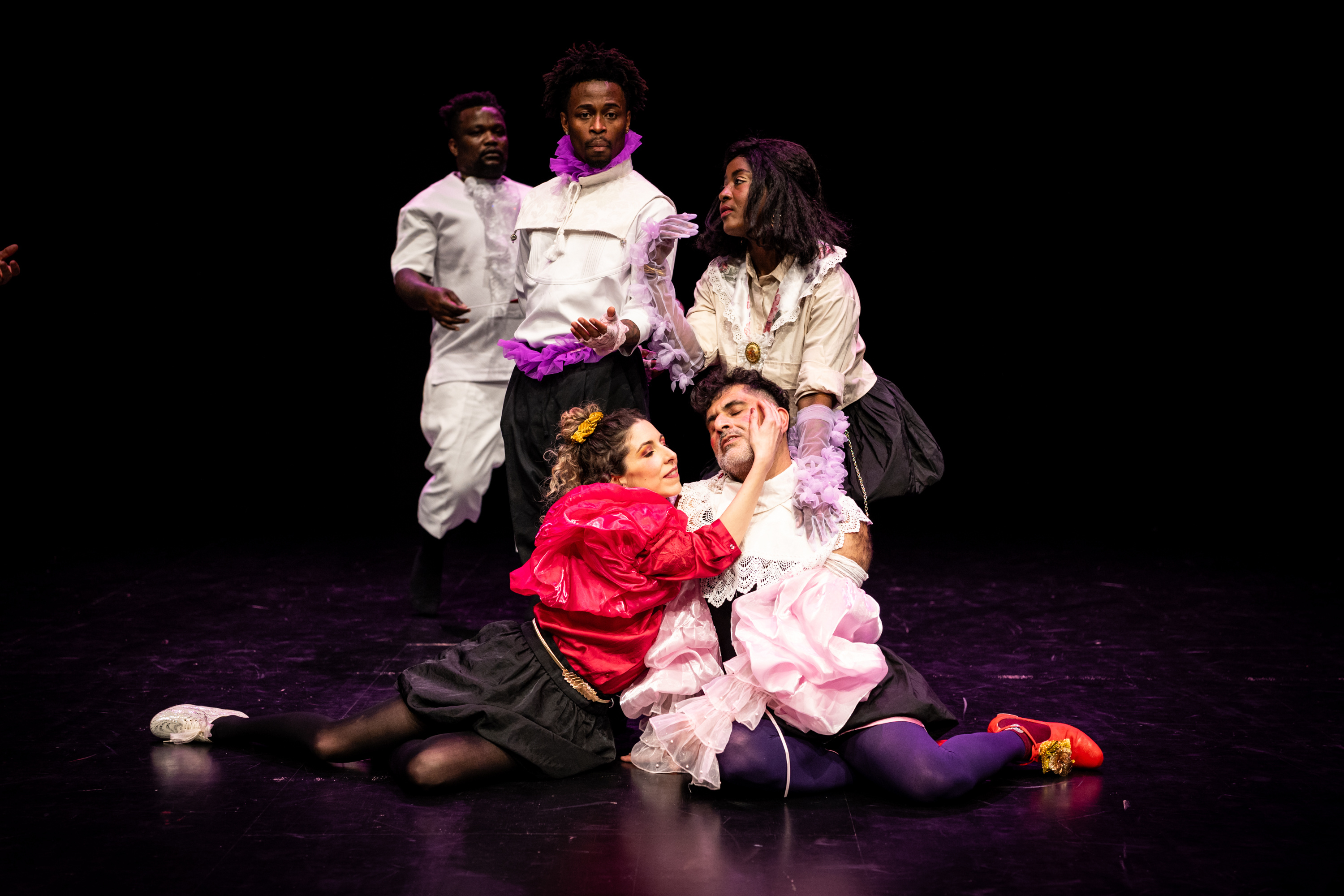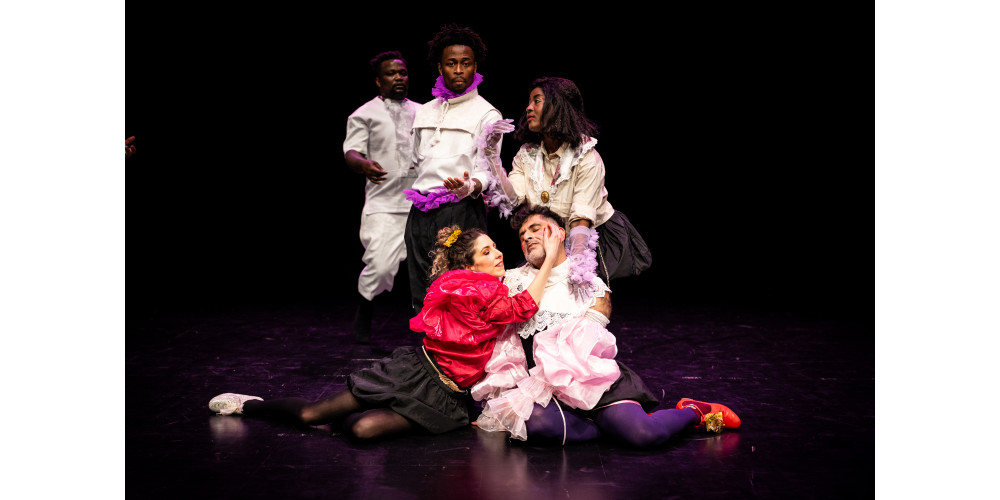 Musik und Choreografie bedienen sich an Elementen des Barock-Balletts, die mit zeitgenössischen Elementen wie elektronischer Musik, E-Gitarren, Hip-Hop bzw. Twerking angereichert werden. Die Kostüme schwanken zwischen barocker Halskrause, Schnallenschuhen und T-Shirts mit Aufdruck. Auch wenn gesprochen wird, befinden wir uns immer schon zwischen den Sprachen: Ein*e Performer*in beginnt auf Französisch, manchmal auf Spanisch, wird jedoch direkt von einem weiteren Ensemblemitglied ins Deutsche oder Englische übersetzt. Was für die Hegemonie der französischen Kolonialmacht stehen sollte, der monolithische Block Molière, zerfällt so in gedoppelte Einzelteile, löst sich auf in postkolonialen Zwischenräumen.