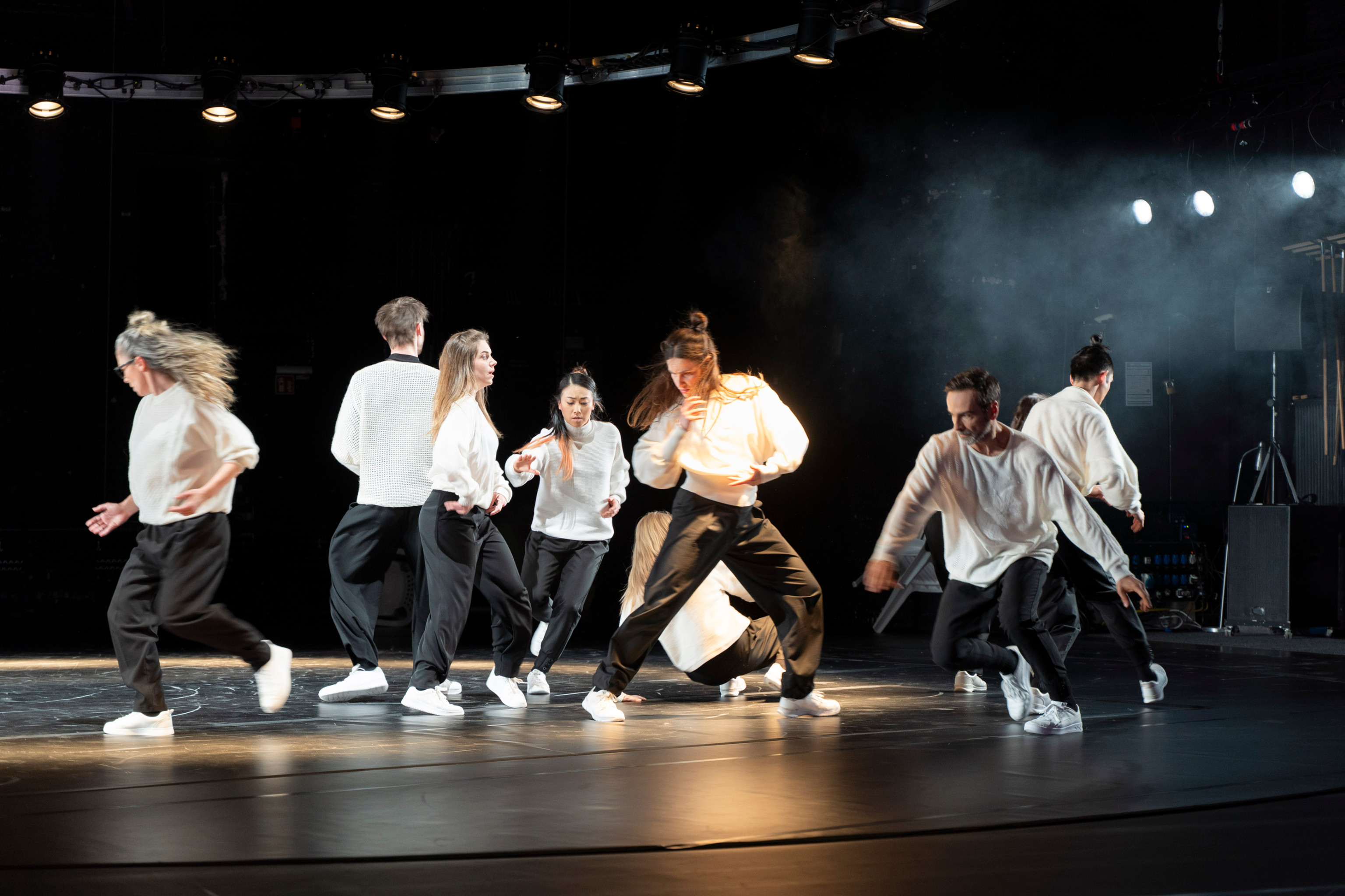 Zuschauer „Roland“ wird aus dem Publikum als Mitspieler auf die Bühne in den Lichtkreis geholt, bekommt eine weiße Jacke verpasst, um sich ebenfalls in dieses Schwarz-Weiß einzureihen. Während einige wenige nicht mehr so uniformiert sind. Vielleicht nicht mehr schwarz-weiß denken wollen? Poetische oder brutale Szenen entstehen am Rande der Lichtarena: