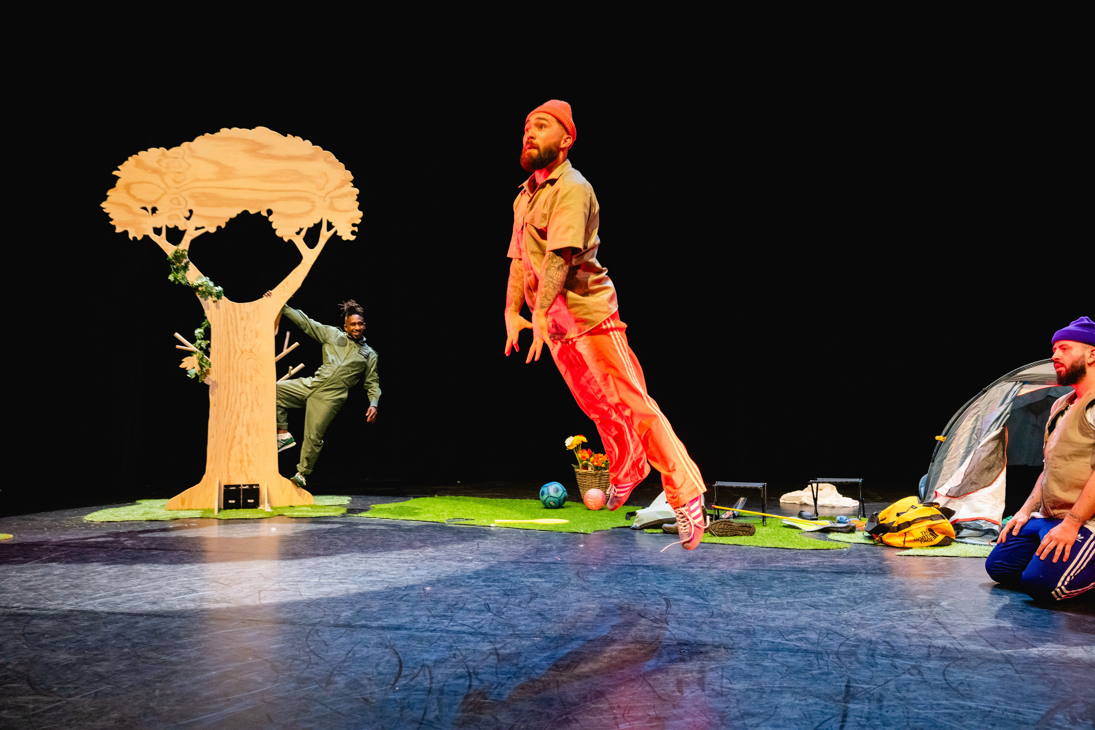 „Close your eyes ... Let's count to 1, 2, 3!“ Sitting in the back row of Uferstudio 1, I hear children can’t help giggling. The warm lights slowly dim and shift into cool tones, the stage transforms into a night garden: grass, flowers, soccer balls, a scooter and a tall wooden tree. The secret garden softly draws the young audience’s attention toward curiosity. This is „Klein, klein vogeltje“, presented by the Netherlands' Lloydscompany for audiences aged six and above, invited by the Purple International Dance Festival for young audiences.