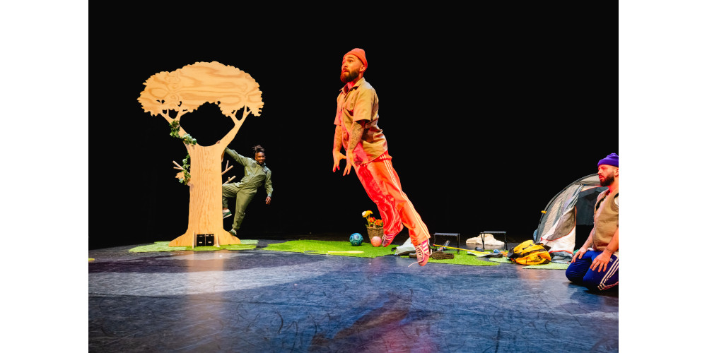 The tree's backside utilizes wooden branches functioning as stairs. A boy dressed in dark denim lies casually on the hollowed-out trunk, he is the „boy who wants to be a bird.“ Contrasting him are two brothers in bright purple and orange beanie hats. The three dancers transform breaking rhythm into vibrant colors, bold physical language and cheerful interaction with their young audience, presenting this novel story of meeting a new friend.